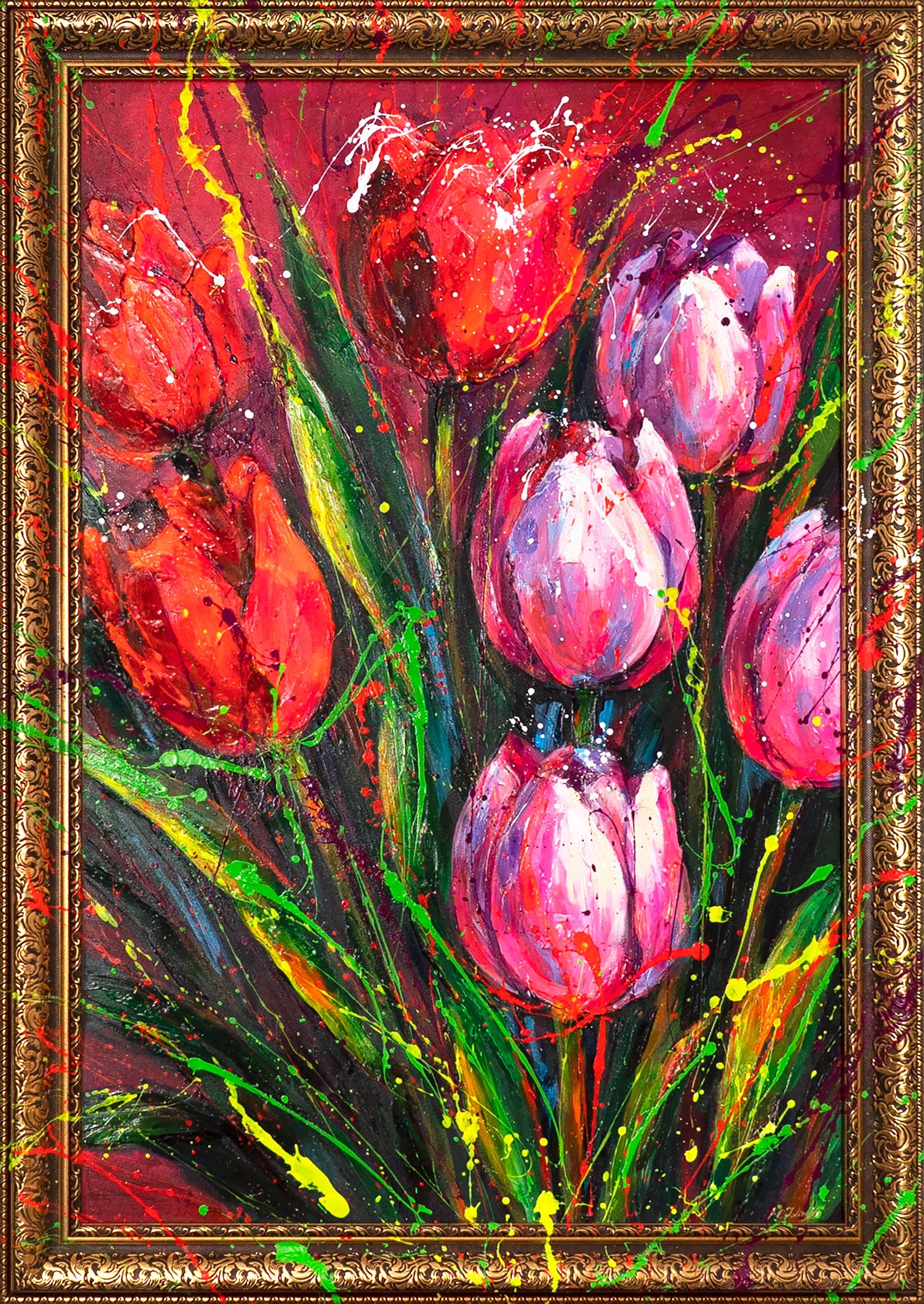 • Flower Painting with Frame – Abstract Tulips on Canvas „Notes of Spring“