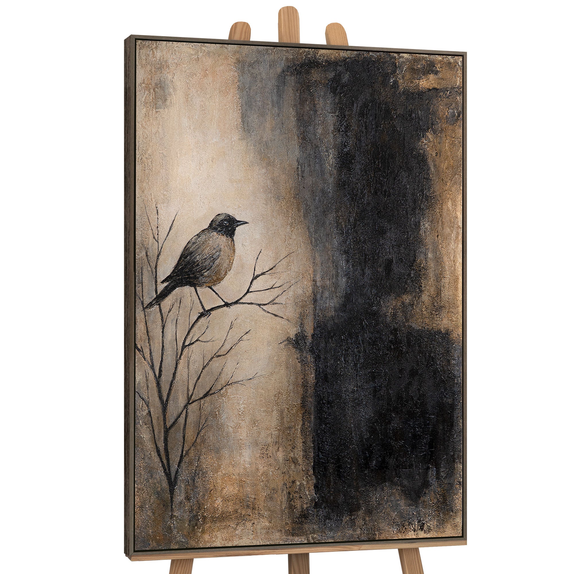 „Ast und Schatten“ ist ein handgemaltes Acrylgemälde, das durch sein ausdrucksstarkes Naturmotiv besticht. Ein einzelner Vogel sitzt auf kahlen Ästen, eingebettet in eine kontrastreiche Komposition aus warmen Beigetönen, erdigen Braunnuancen und tiefem Schwarz. Die strukturierte Oberfläche verleiht dem Bild Tiefe und eine lebendige Haptik, die den Blick fesselt.