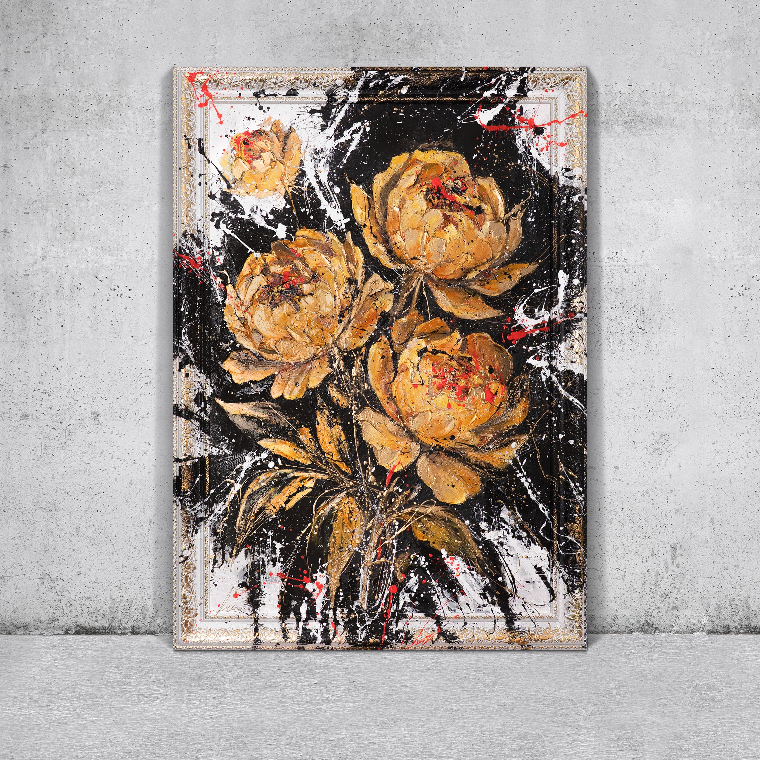 • Hand-Painted Acrylic Painting with Gold Flowers – Wall Art Decor „Velvety Shine“
