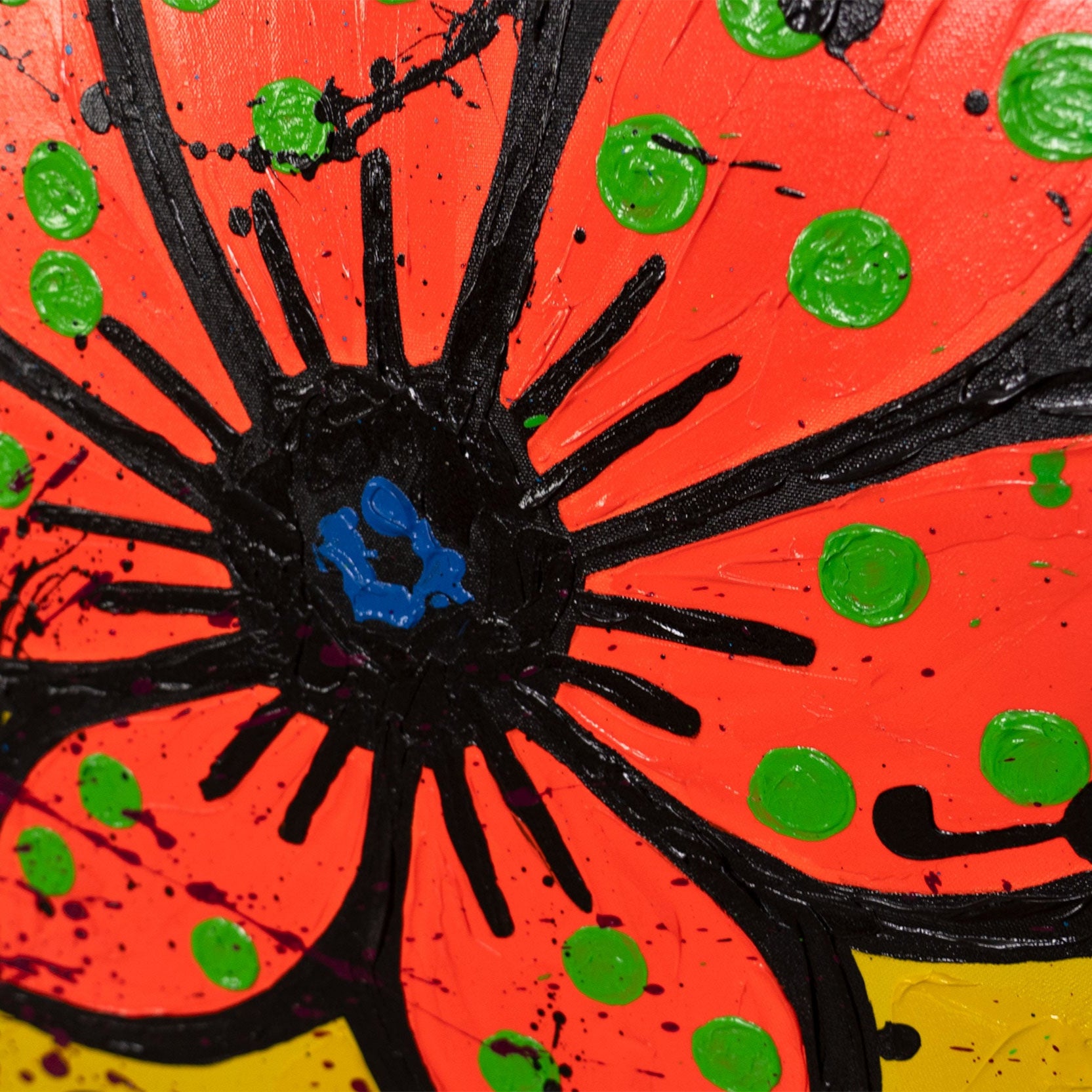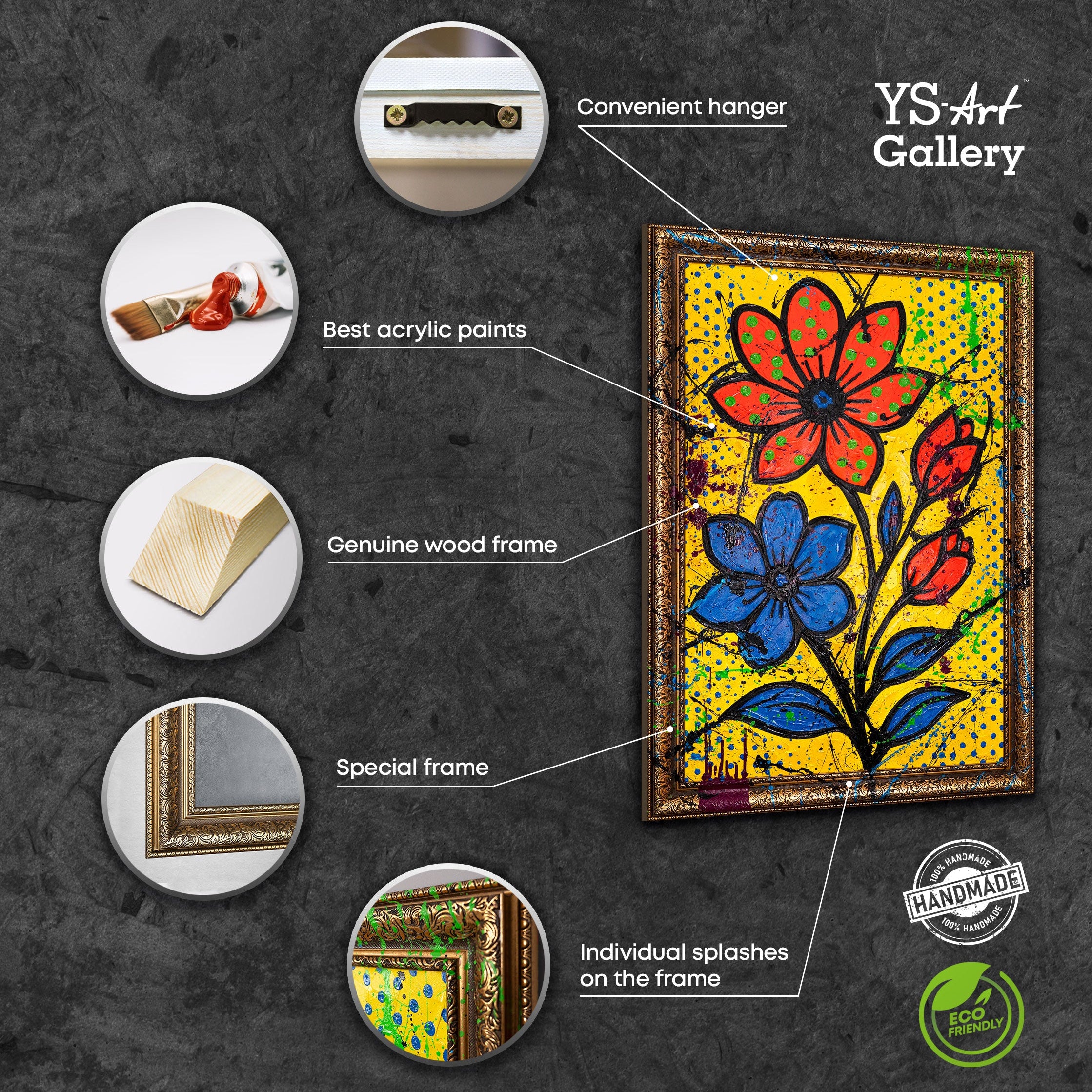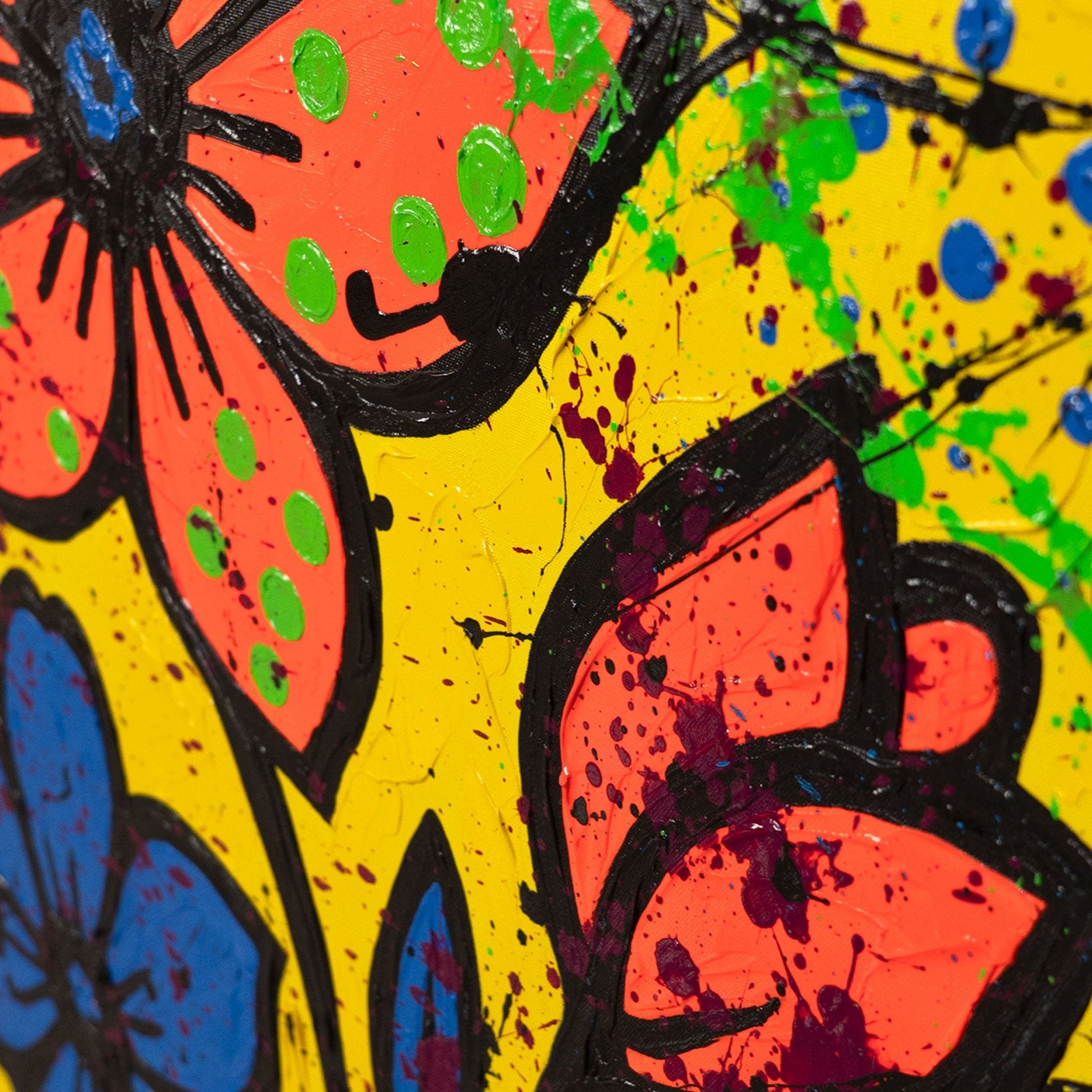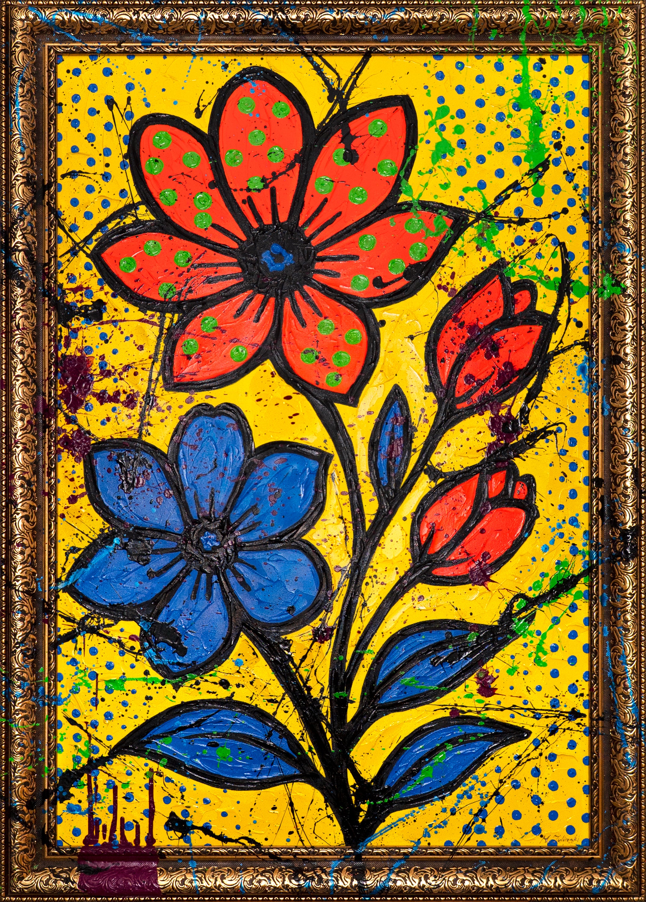 „Bloom Frenzy“ is a vibrant Pop Art floral painting that radiates energy and joy. The bright yellow background, red and blue blossoms with green accents, and dynamic color splashes make this artwork an expressive statement of modern art. Every detail is hand-painted and unique.