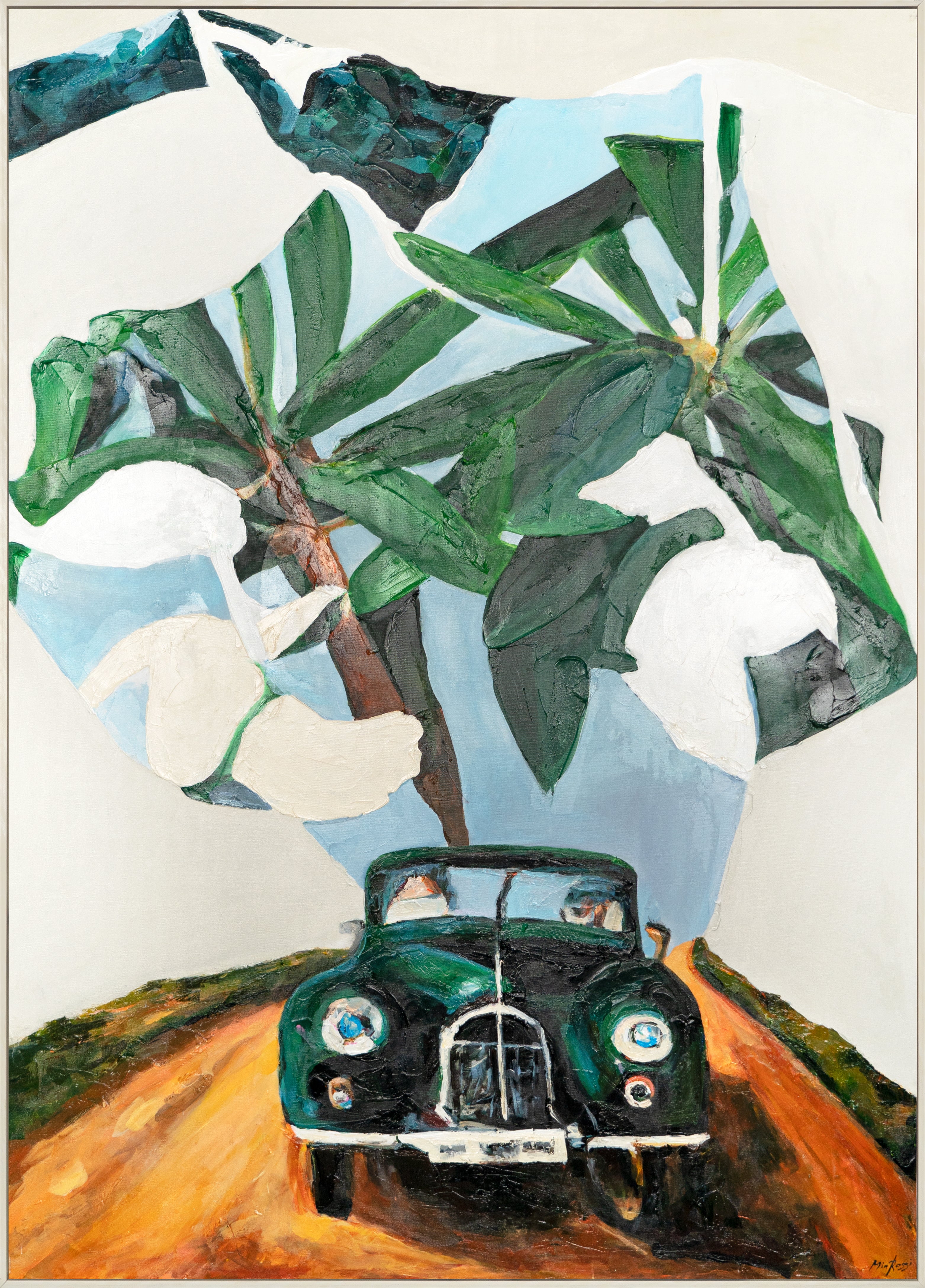 A dark green vintage car winds its way along an ochre-colored road, while massive palm leaves dominate the sky behind it. The scene feels like a still from a nostalgic tropical adventure – simultaneously realistic and abstract. Vibrant greens, textured brushstrokes, and intentionally placed negative space give the composition expressive depth, evoking a palpable sense of wanderlust and freedom.