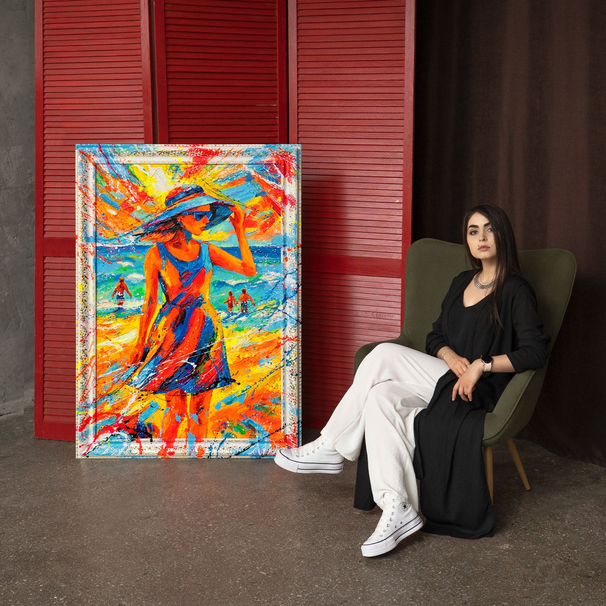 „Summery Grace“ captures the lightness and elegance of a summer day: A woman in a colorful dress, with a sun hat and sunglasses, stands by the sea as waves, sunlight, and light explode behind her. The vibrant colors – blue, orange, red, and yellow – radiate energy, freedom, and holiday vibes. Every brushstroke is hand-painted, each color trail an expression of artistic power.