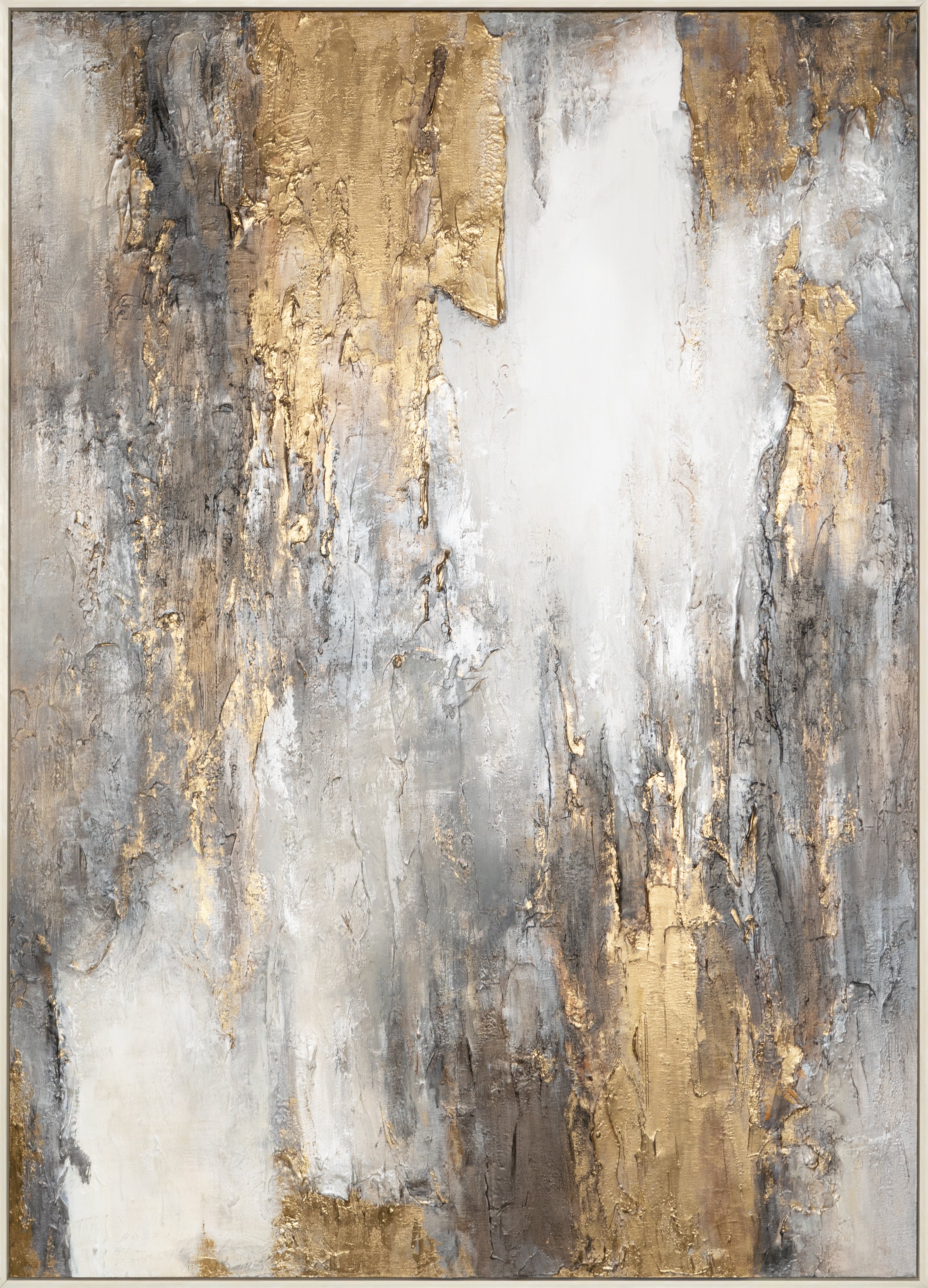 A unique acrylic painting that unfolds a calm, timeless aura through its textured surface and harmonious color palette of Gold, Gray, and Beige. The vertical flow of the textures resembles gently descending water, conveying a sense of inner balance and quiet movement. Gold accents capture the light, giving the composition a luxurious depth.