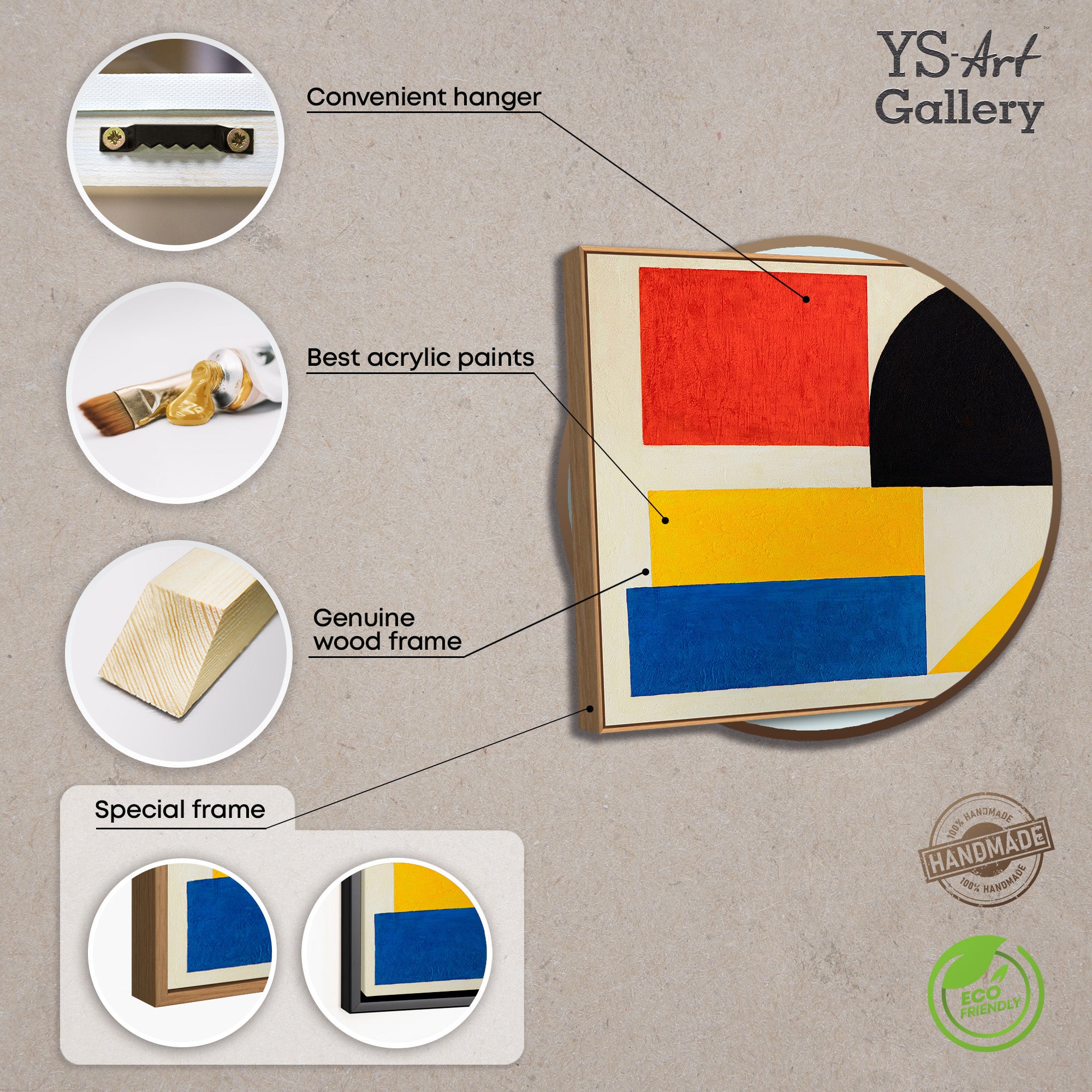 This abstract painting thrives on clear color fields and strong contrasts. Intense reds, yellows, and blues meet deep blacks and serene light areas. The geometric composition appears balanced yet powerful, while the textured acrylic surface clearly emphasizes its hand-painted character.