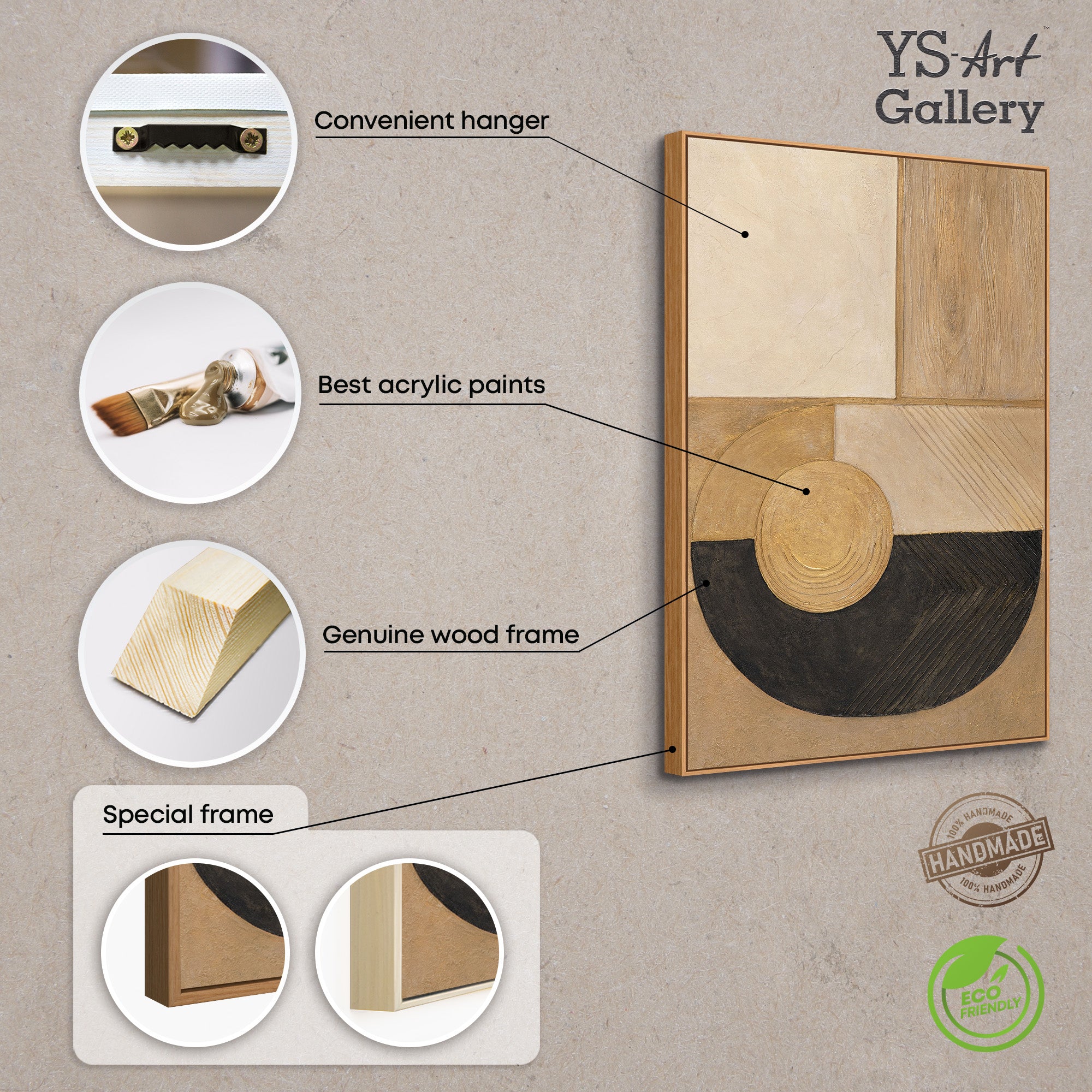 „Form und Textur“ ist ein handgemaltes abstraktes Gemälde, das geometrische Formen mit ausgeprägter Oberflächenstruktur kombiniert. Klare Flächen in Beige-, Sand- und Schwarztönen werden durch goldene Akzente und reliefartige Linien ergänzt, wodurch eine ruhige, architektonische Bildwirkung entsteht.