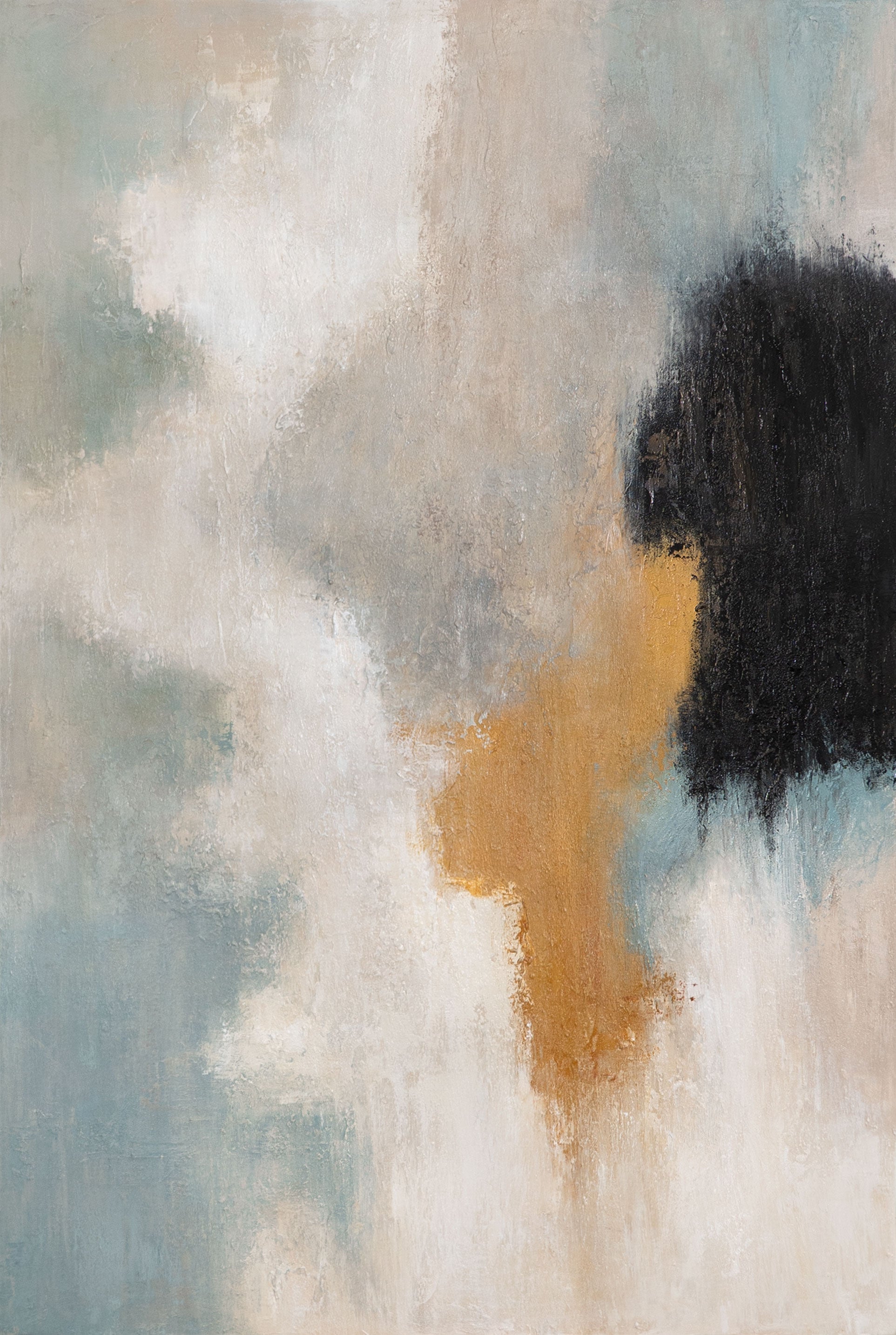 „Lichtübergänge“ ist ein modernes, handgemaltes Acrylgemälde, das mit seiner harmonischen Verbindung aus hellen Beige-, sanften Blau- und kräftigen Schwarztönen fasziniert. Warme Goldakzente verleihen dem Bild eine besondere Strahlkraft, während die reliefartige Struktur Tiefe und Bewegung betont.