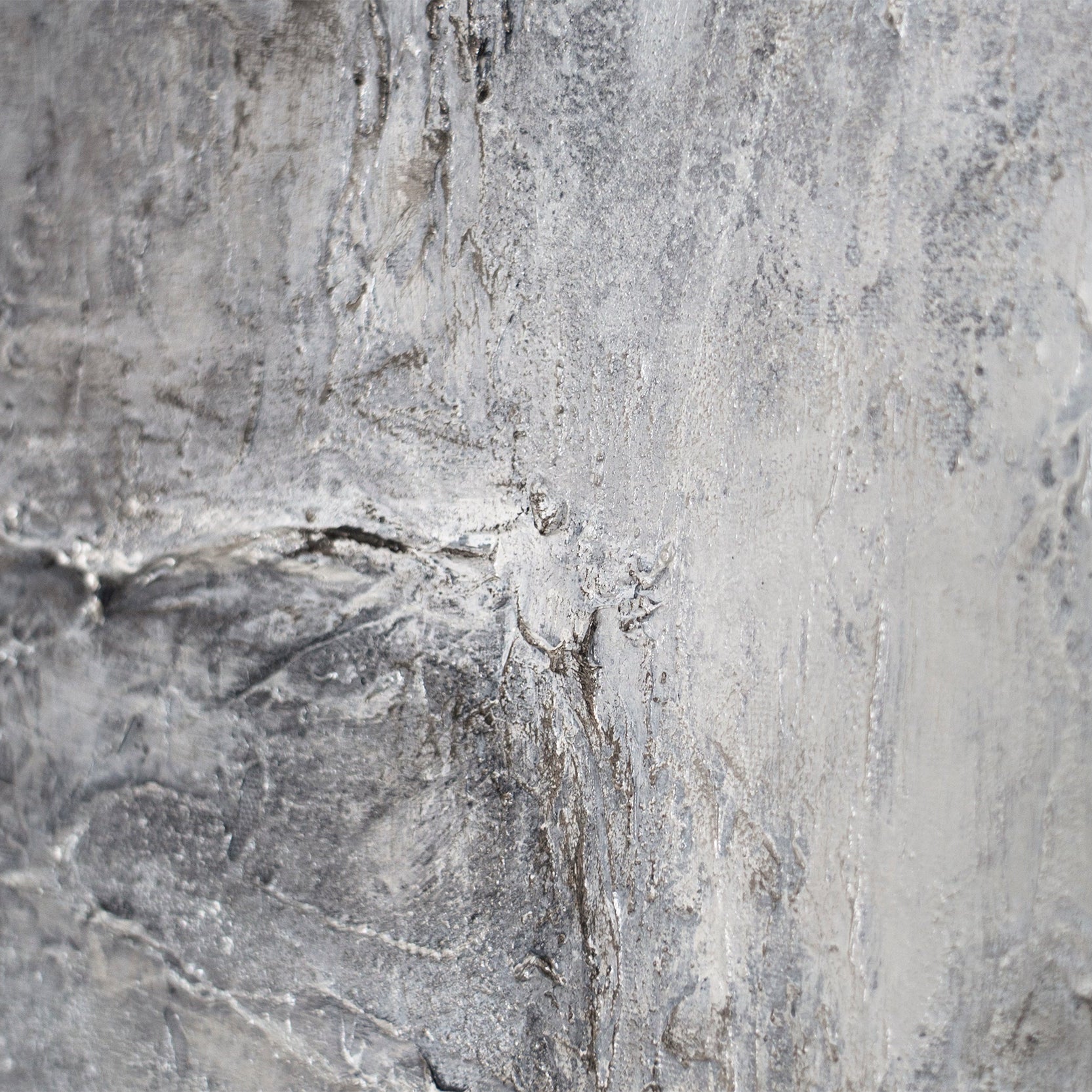 This abstract painting utilizes a multi-layered gray palette and a pronounced, stone-like texture. Irregular surfaces, subtle transitions, and deliberately visible structures create depth and a calm, material effect. The surface is reminiscent of natural rock formations, lending the work a restrained, timeless presence.