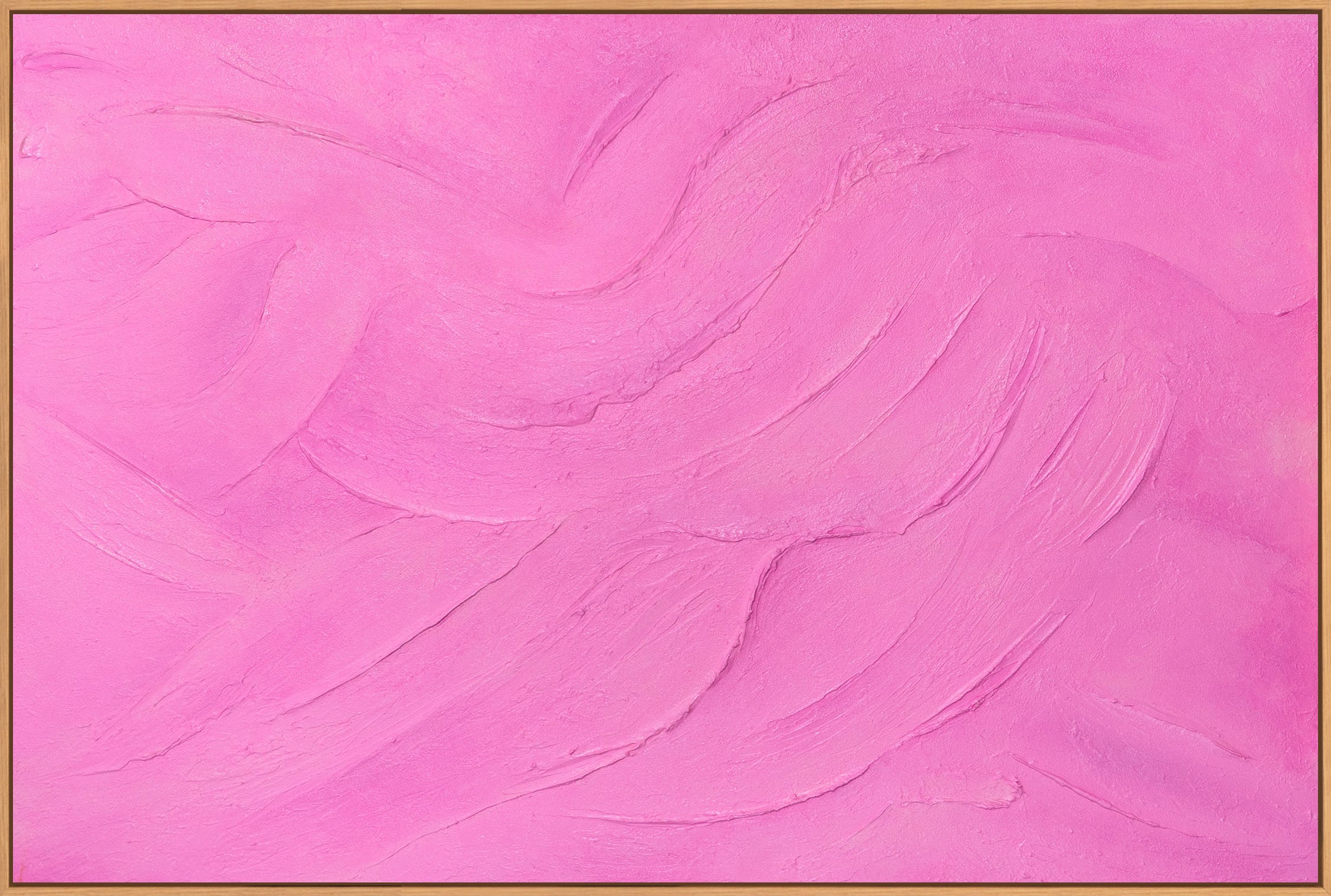 The abstract artwork "Sugar Veil" features a finely textured surface in vibrant shades of pink and rose. The acrylic paint appears soft and flowing, while the hand-painted palette knife marks create a subtle depth and lively texture. The areas of color seem to move gently, creating a serene, modern visual effect.