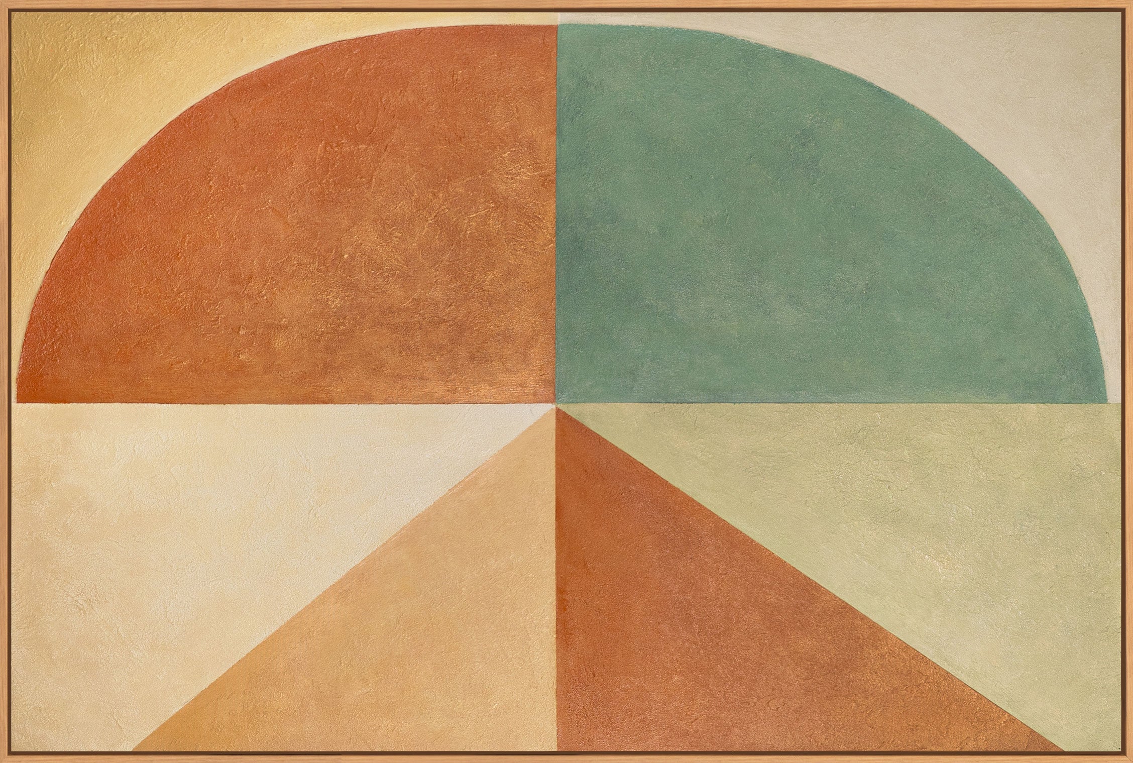 “Forms in Balance” is a hand-painted abstract acrylic painting with a clear division of space and a calm geometric effect. Semicircular and triangular shapes combine warm terracotta tones with beige and muted green, creating a balanced visual order.