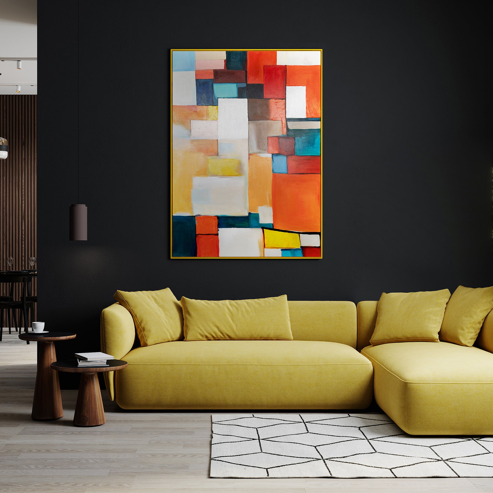 This modern living room mural is characterized by its vibrant colors and smooth texture, achieved through the use of high-quality acrylic paints. The included frame protects the artwork and makes it easy to hang. To keep your painting in the best condition, avoid direct sunlight and clean the surface gently with a dry, soft cloth.