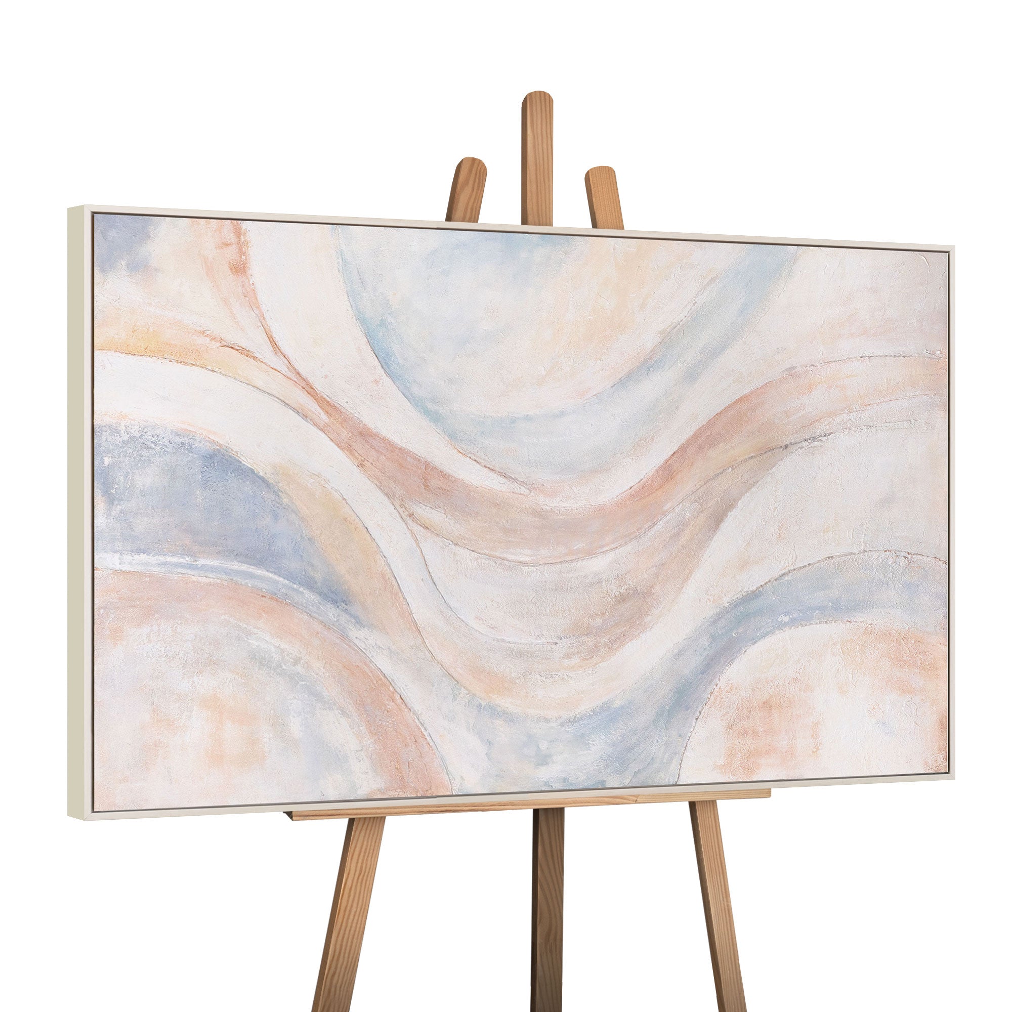 The hand-painted acrylic painting "Wind Lines" enchants with its delicate color composition of soft pastel tones such as Beige, Blue, and Rosé. Flowing lines form a harmonious abstraction reminiscent of movement, lightness, and gentle natural moods. The textured surface adds depth, making the piece a special focal point.