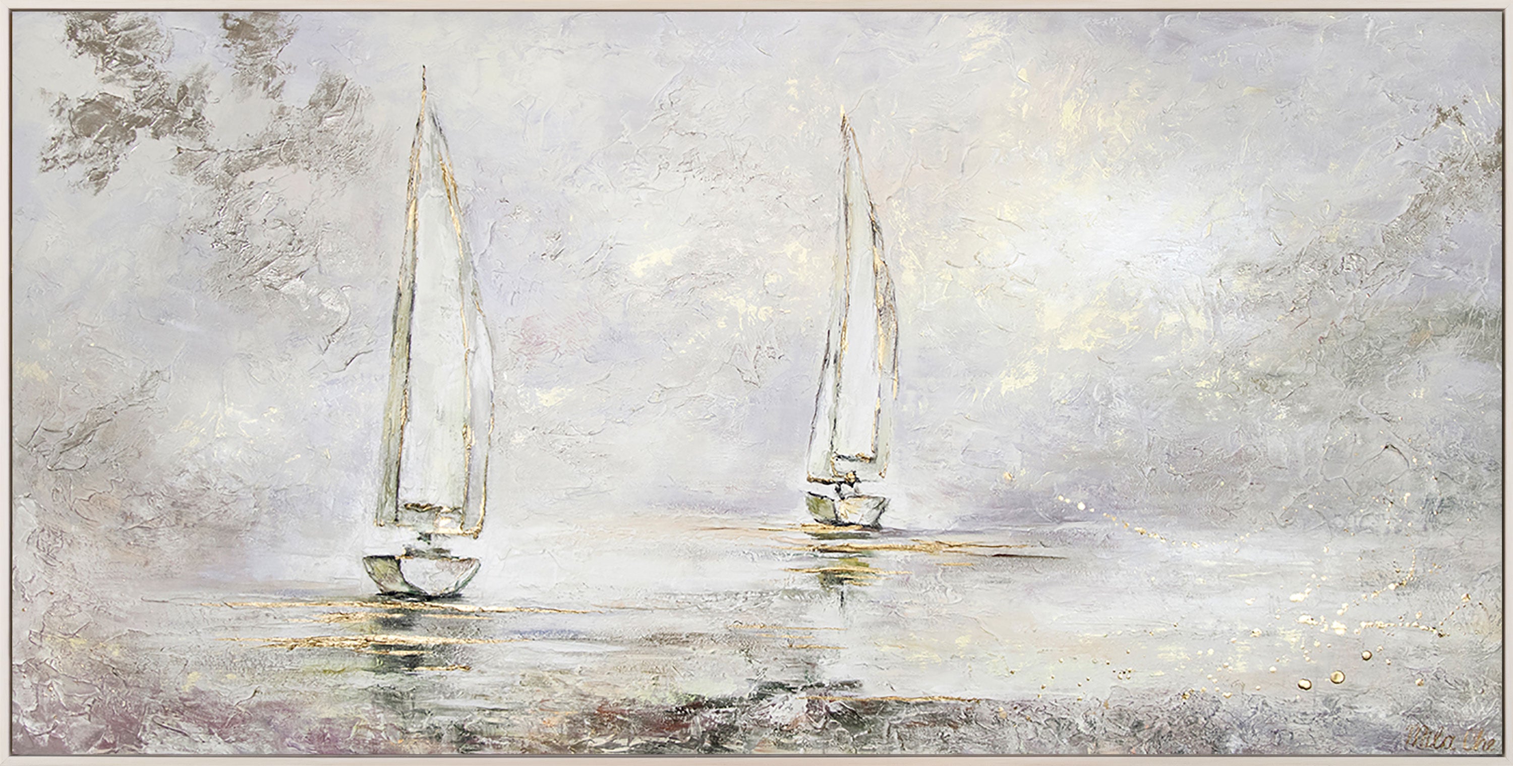This unique landscape painting captures the tranquil and mystical atmosphere of a misty morning by the sea. The elegant sailboats, painted in delicate shades of white and gray, glide silently across the water's surface. The subtle golden accents lend the image a touch of luxury and exclusivity.