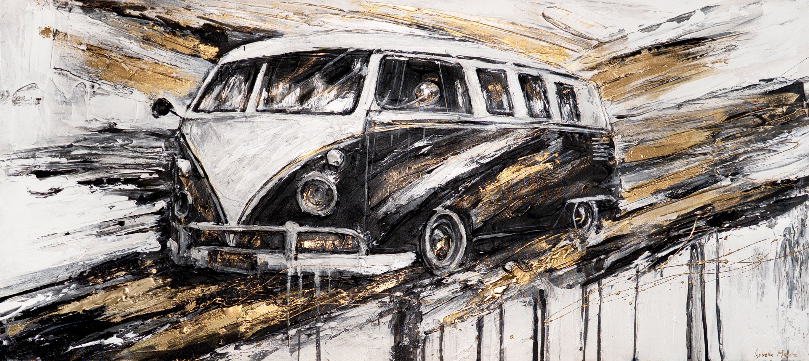 "Street of Time" is a dynamic, hand-painted acrylic piece featuring a retro vehicle in motion. The textured surface and contrasting color scheme of black, white, and gold convey both energy and nostalgia, combining modern design with classic appeal.