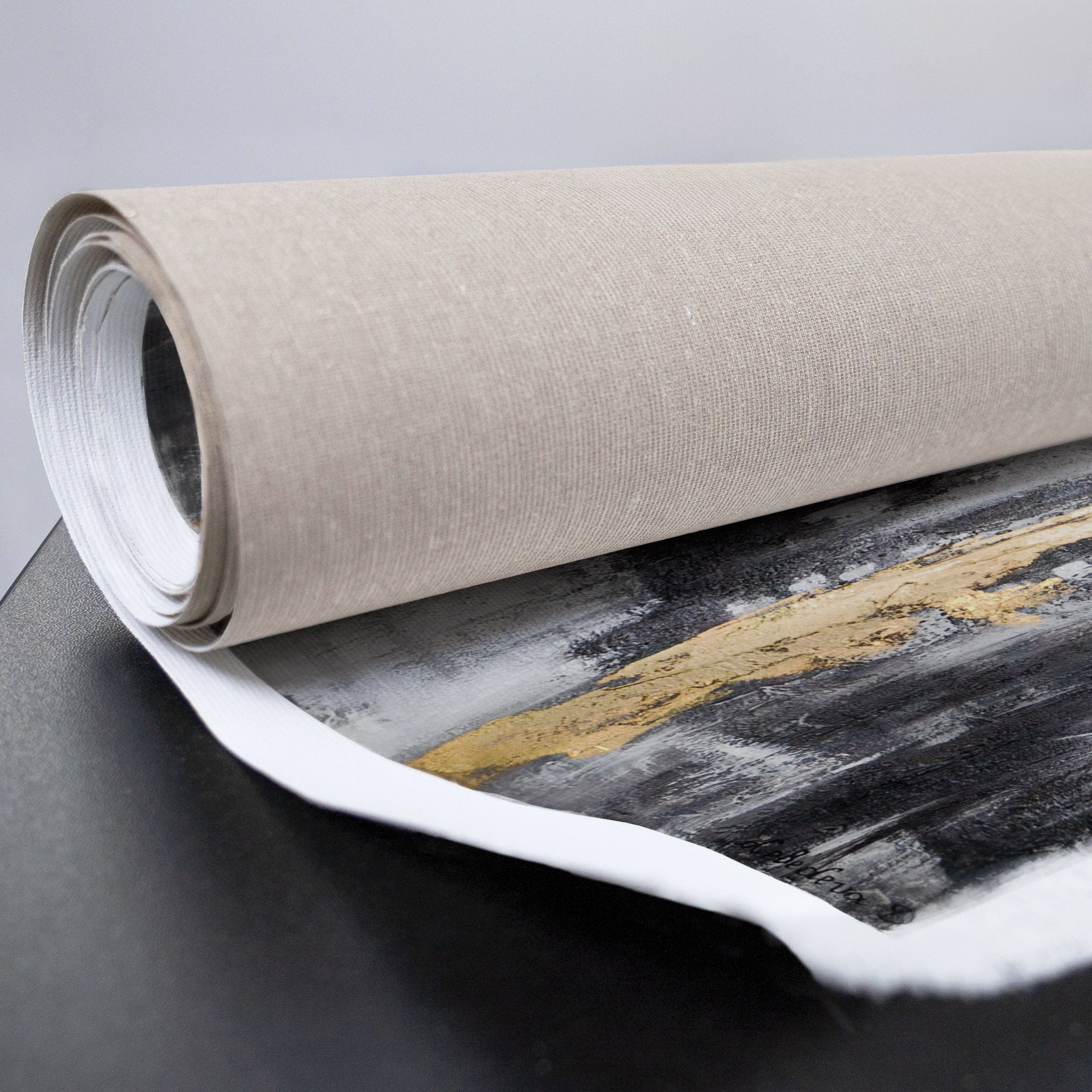 • zusammengerollte Leinwand mit schwarz-goldenem Motiv