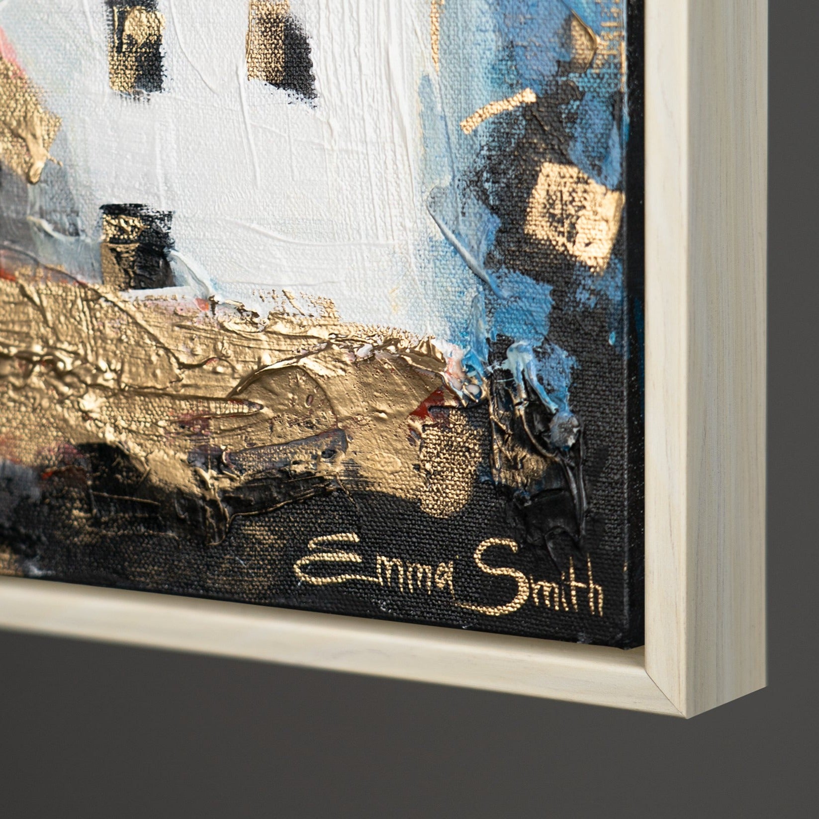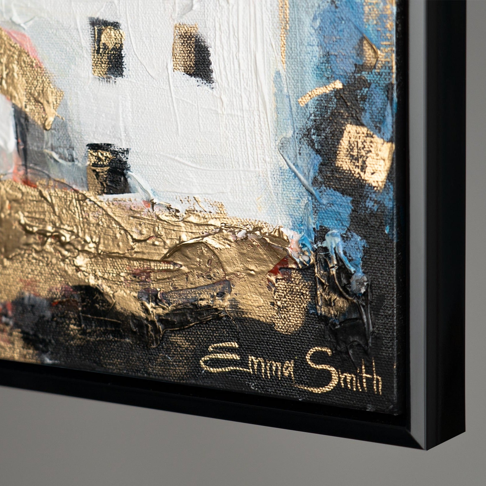 Enrich your home or office with this colorful framed abstract artwork depicting a picturesque cityscape in vibrant colors. The painting features bold hues and expressive brushstrokes. It is 100% hand-painted and is highlighted by an elegant frame.