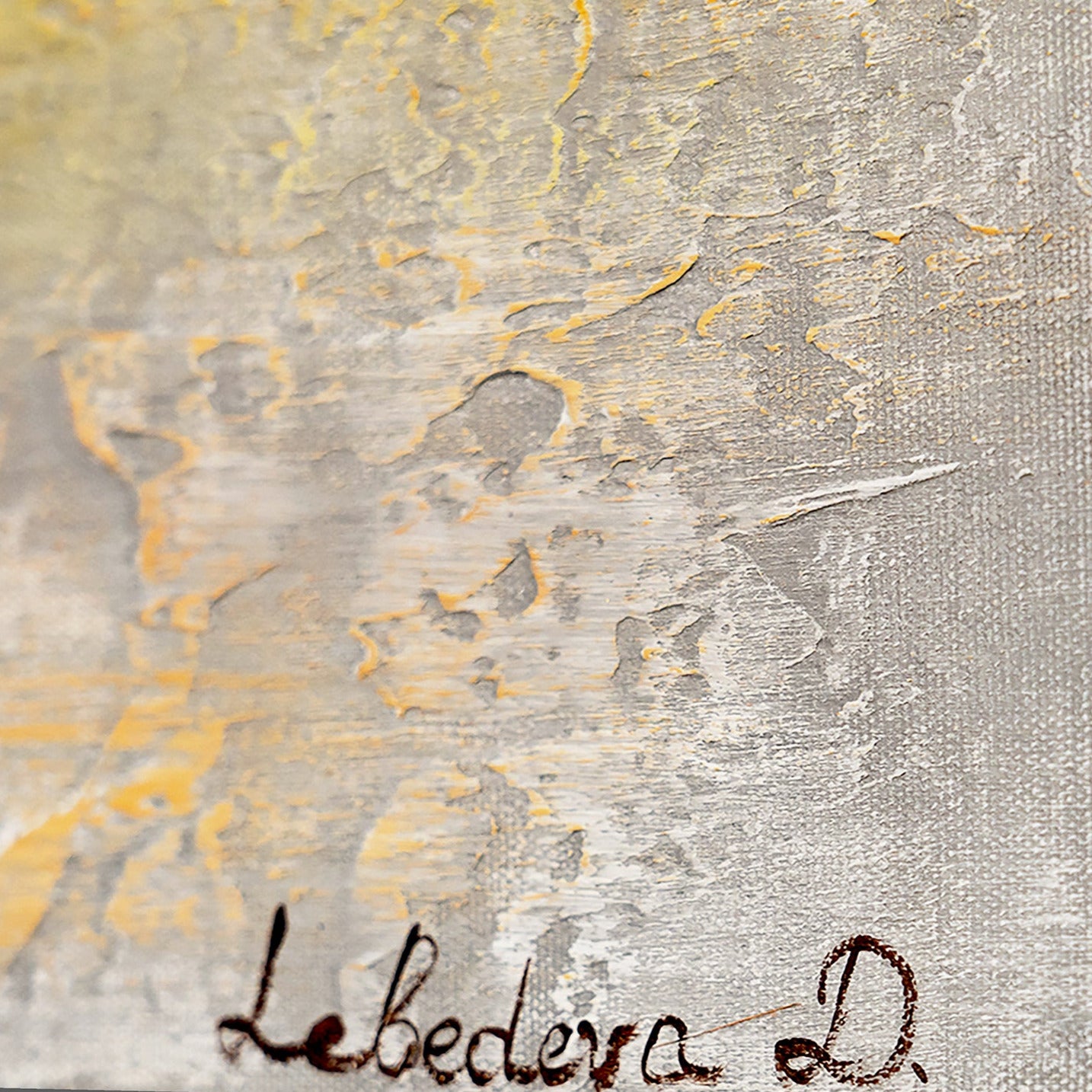 The hand-painted acrylic canvas "Golden Abstraction" features an abstract composition in subtle gray tones accented with elegant gold highlights. Its textured surface adds depth and liveliness, making it a sophisticated focal point in any room. The warm color palette integrates seamlessly into modern living and workspaces.