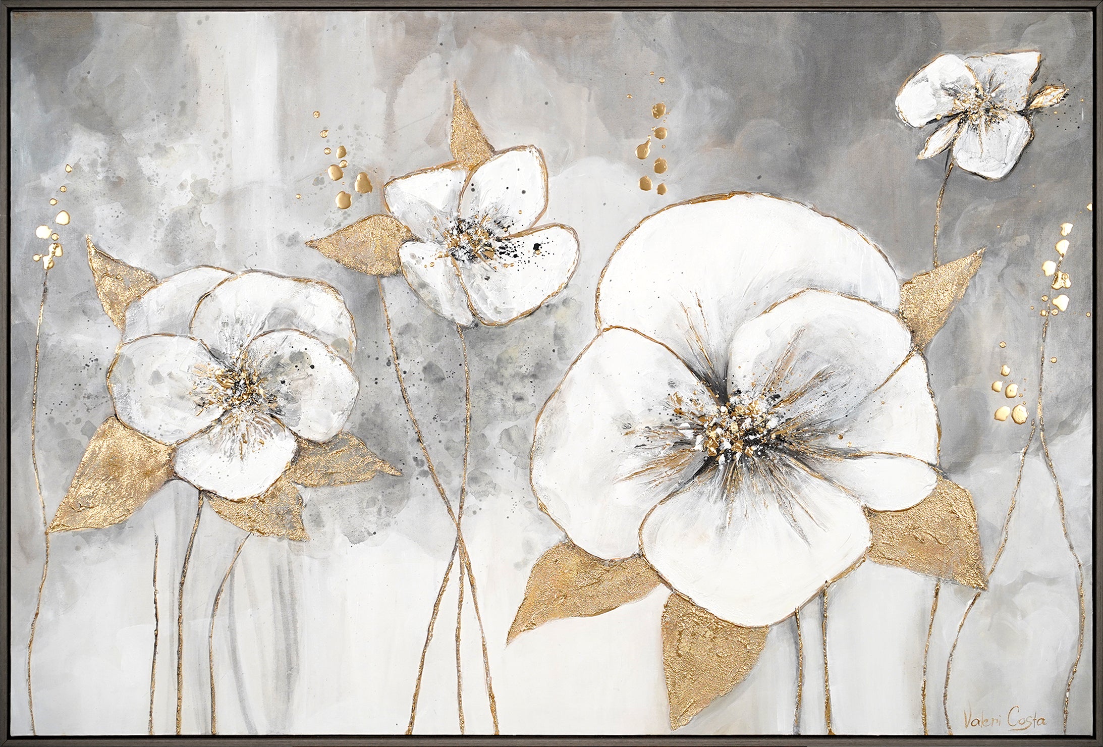 Experience floral elegance in its finest form: "Golden Flowers" is a hand-painted acrylic painting that artfully combines golden accents and white flowers on a textured background. The sculpted flower shapes stand out in metallic gold tones against the light gray background, giving the painting a modern yet timeless aura. The composition is perfectly balanced, creating a calm and harmonious atmosphere.