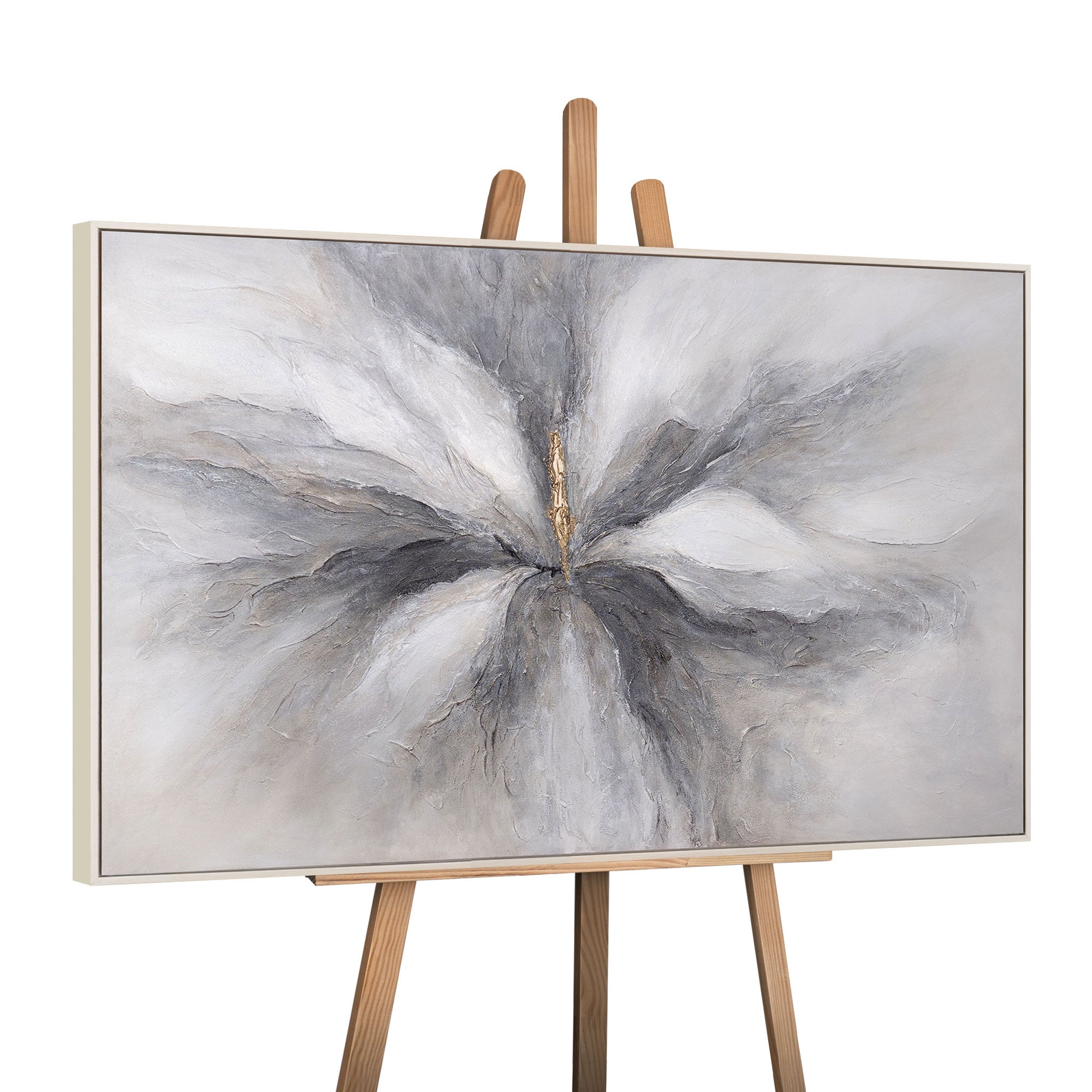 "Golden Moment" is an elegant, hand-painted acrylic painting that captivates with its timeless color combination of Gray, White, and soft Beige tones. In the center of the piece runs a golden accent that infuses the composition with noble warmth and makes the relief-like texture shine. The sculptural brushstrokes add depth and dynamism, creating a harmonious radiance full of elegance.