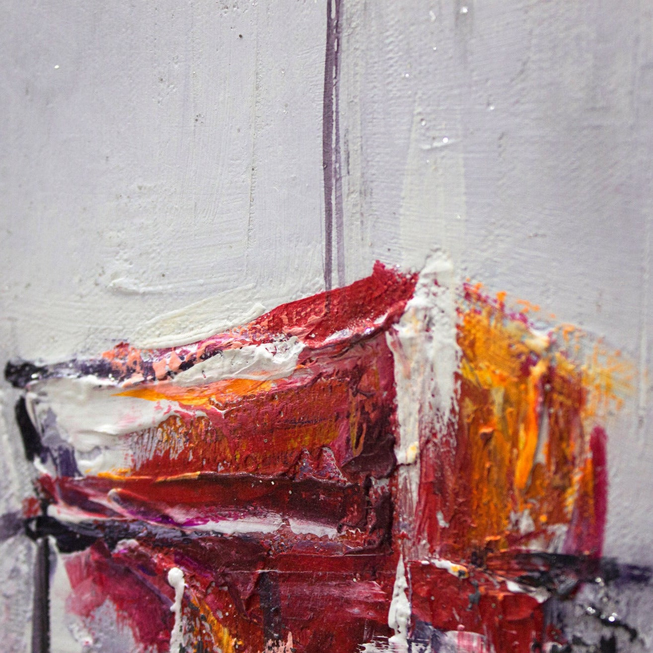 The acrylic painting „Stiller Hafen“ depicts a serene harbor scene with red boats and pastel accents. The hand-painted acrylic technique creates a textured surface, giving the artwork depth and vibrancy. Its soft color palette adds a calming atmosphere that harmoniously complements any room.