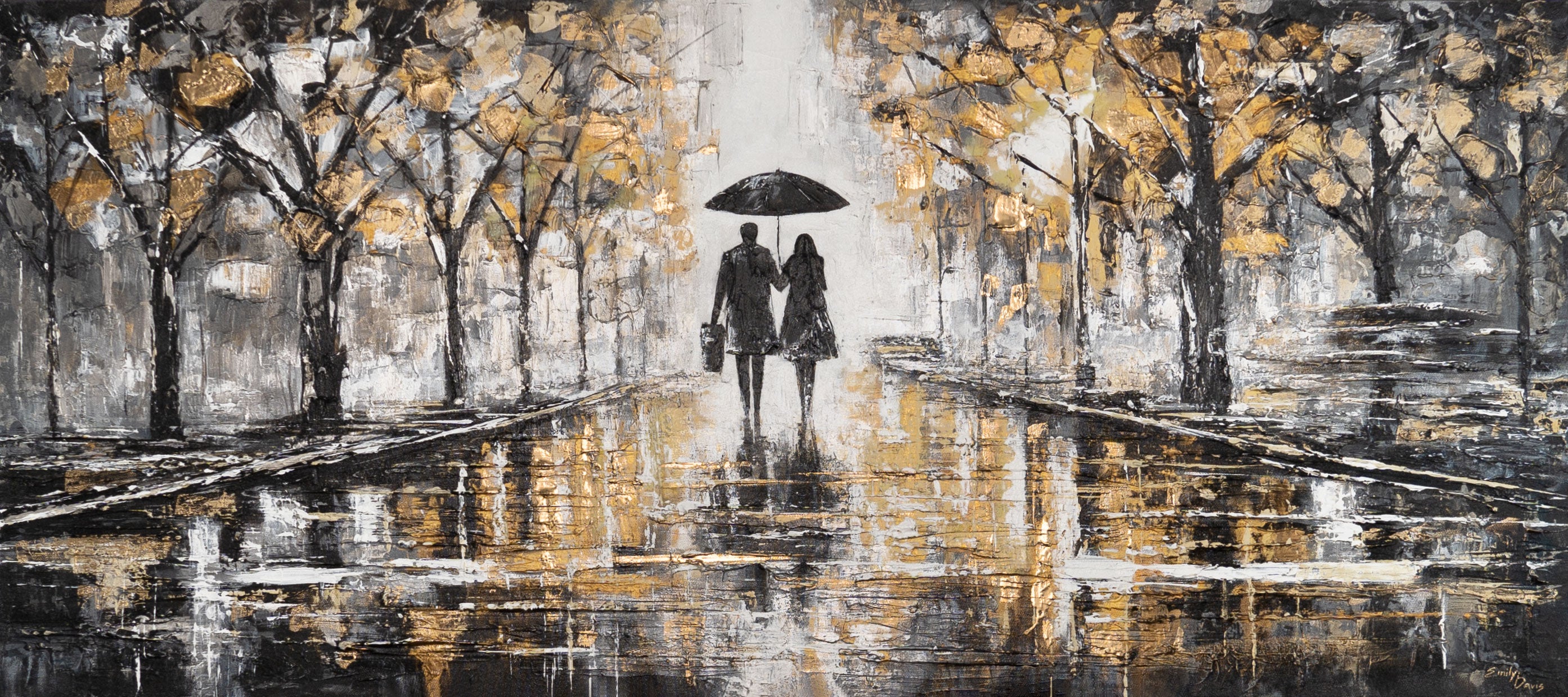 "Together We Go" is a hand-painted acrylic painting depicting a couple walking together through a golden-tinged park in the rain – a symbol of closeness, trust, and harmony. The reflecting puddles and the interplay of black, gray, and gold bring depth and emotion to the piece.
