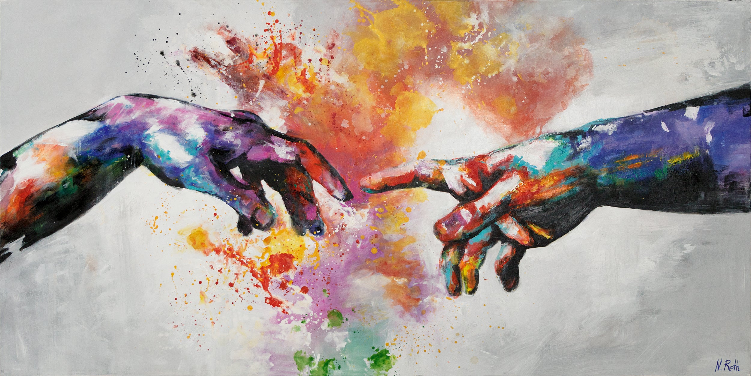 Immerse yourself in the world of vibrant and expressive art with this hand-painted painting. It features a dynamic composition of figures and shapes in bold colors that will transform any wall into a focal point. This work of art is completely handcrafted and carefully presented in a matching frame that perfectly complements the overall look.