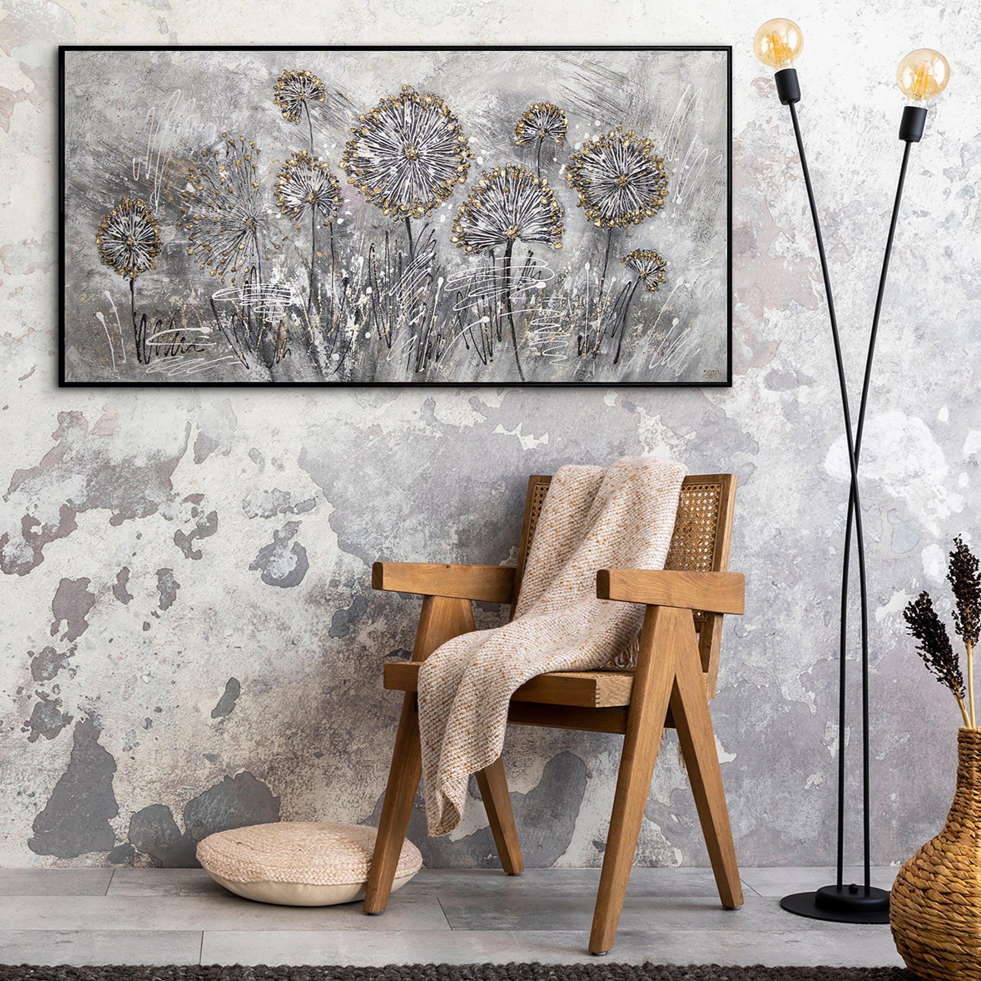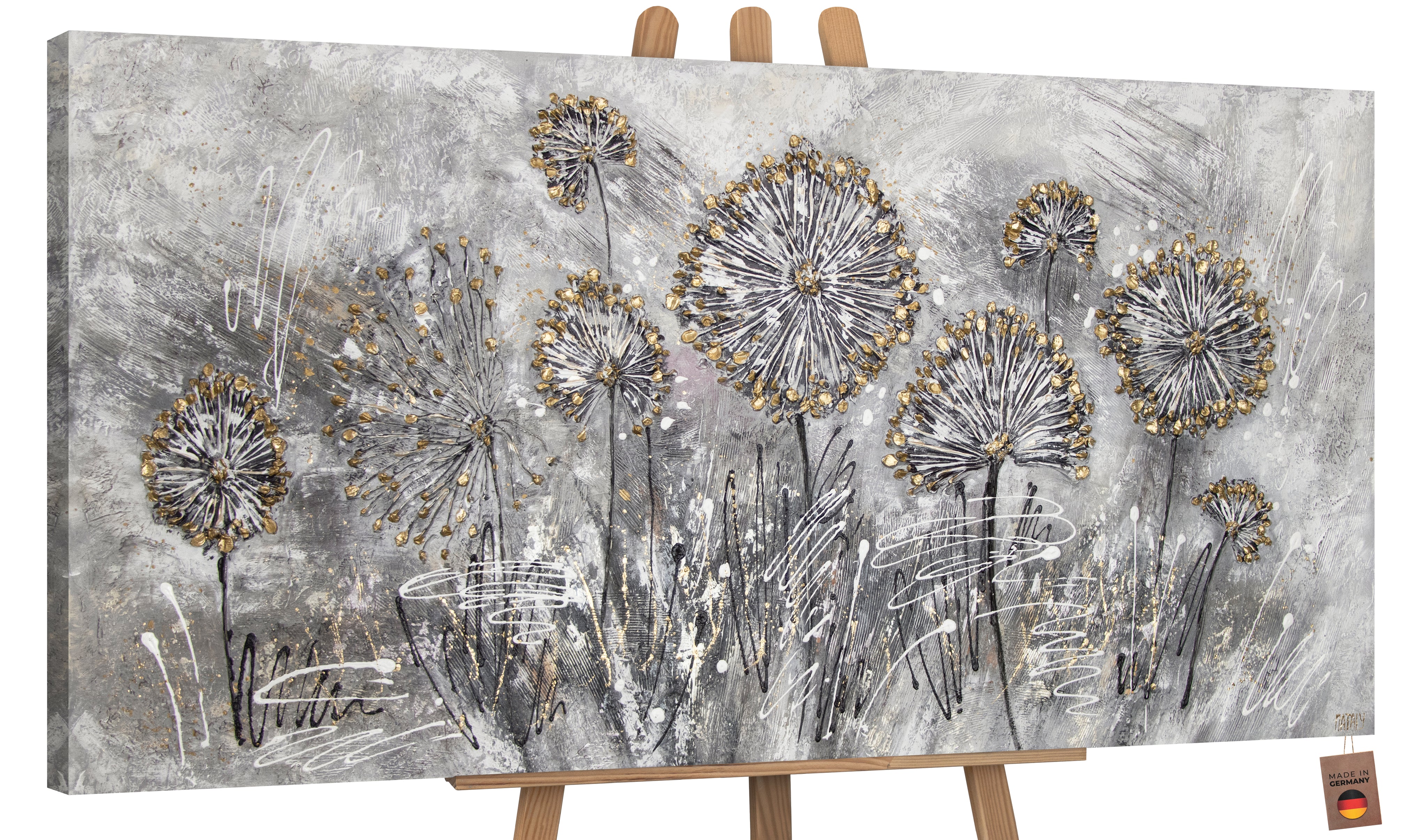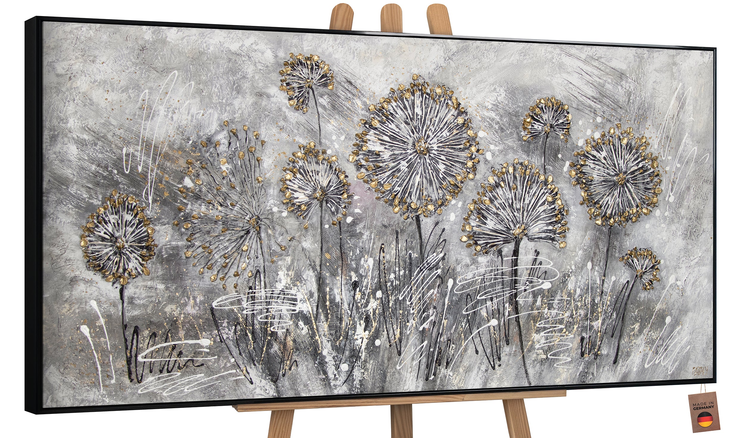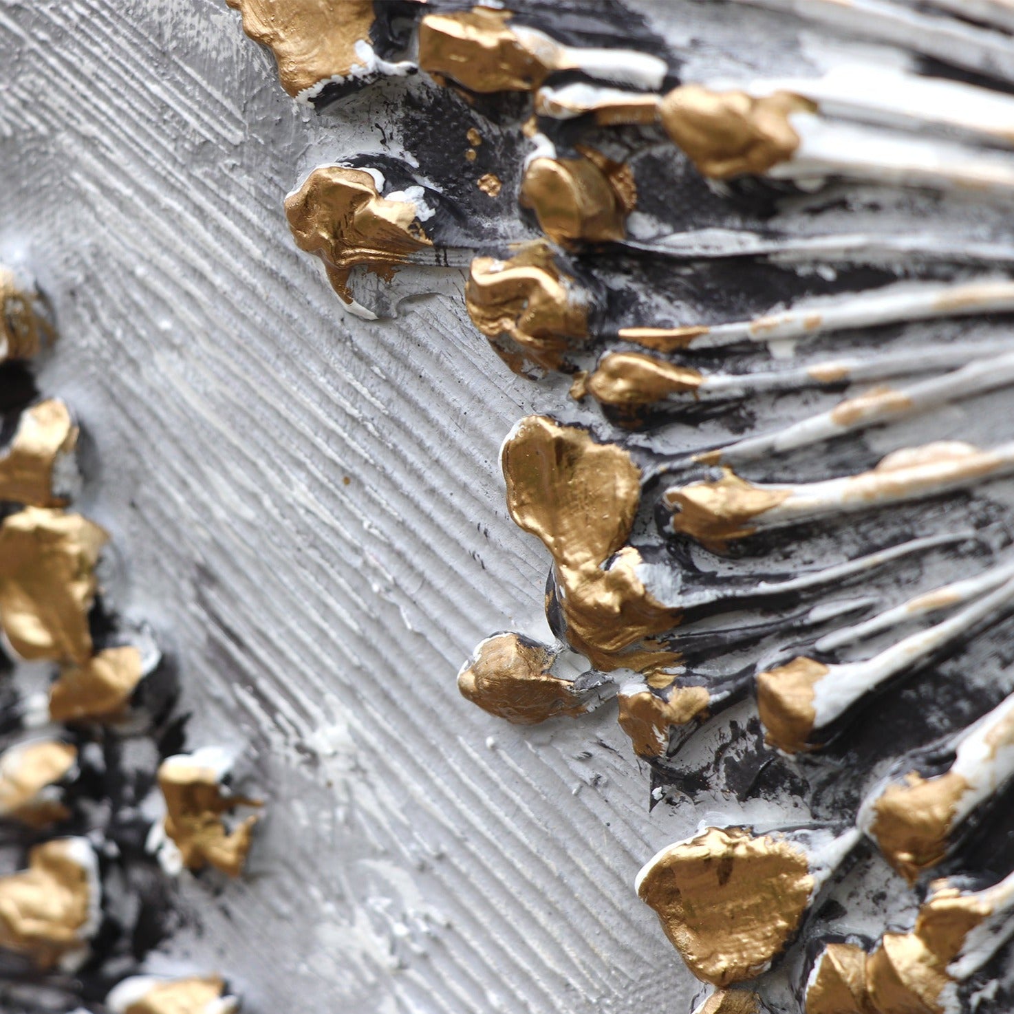 Add a special touch to your home with this hand-painted floral painting. The artistically designed flowers in shades of gray and gold create an elegant and modern atmosphere. Every detail of this painting is completely handmade, making each piece a unique work of art. Enjoy our free delivery directly to your home.