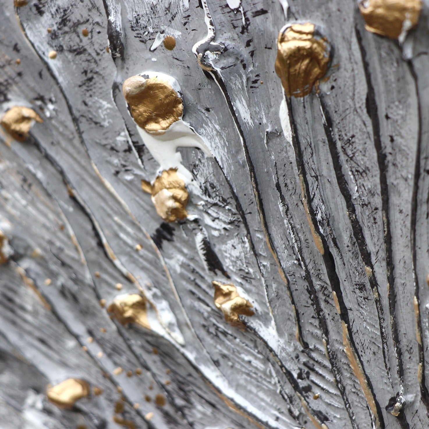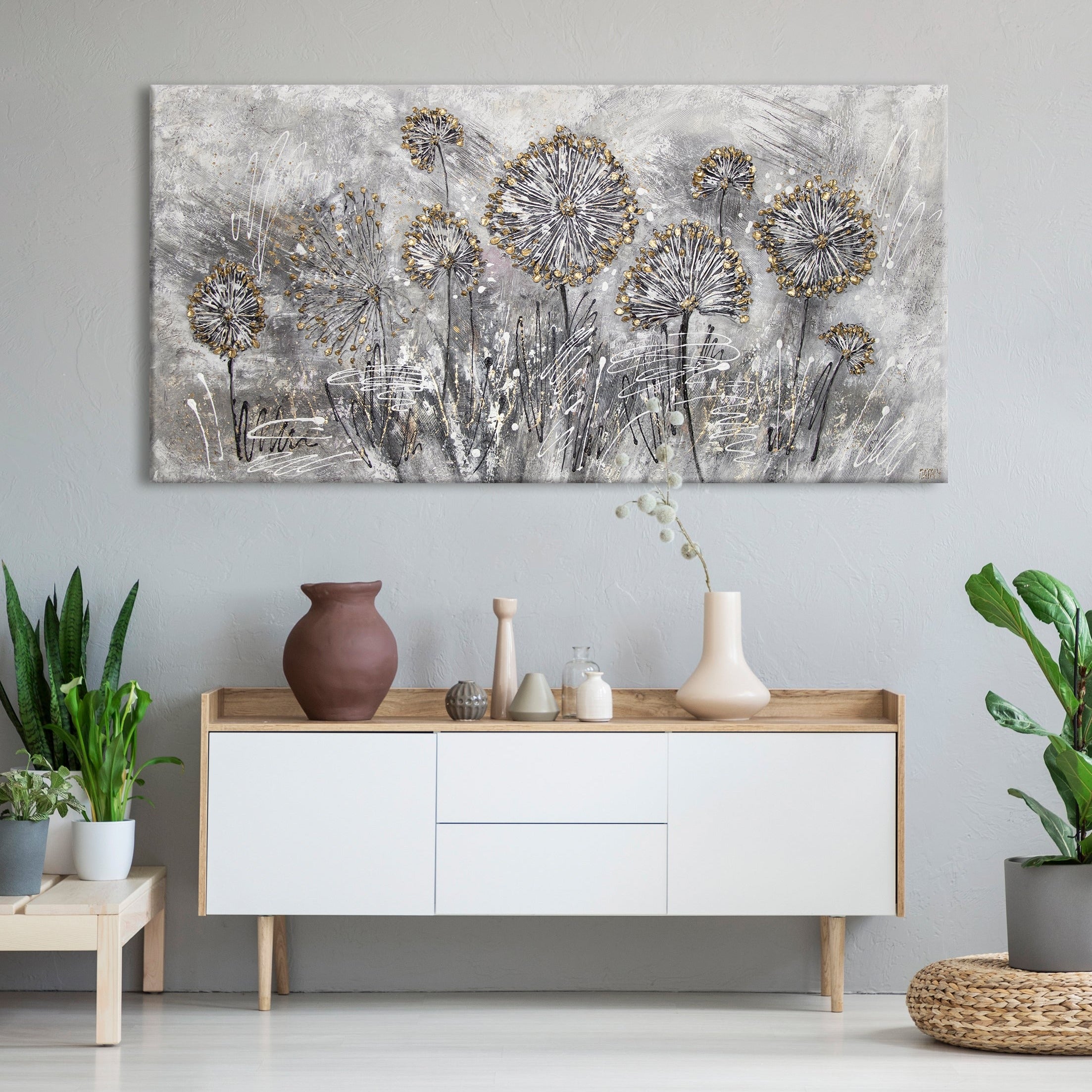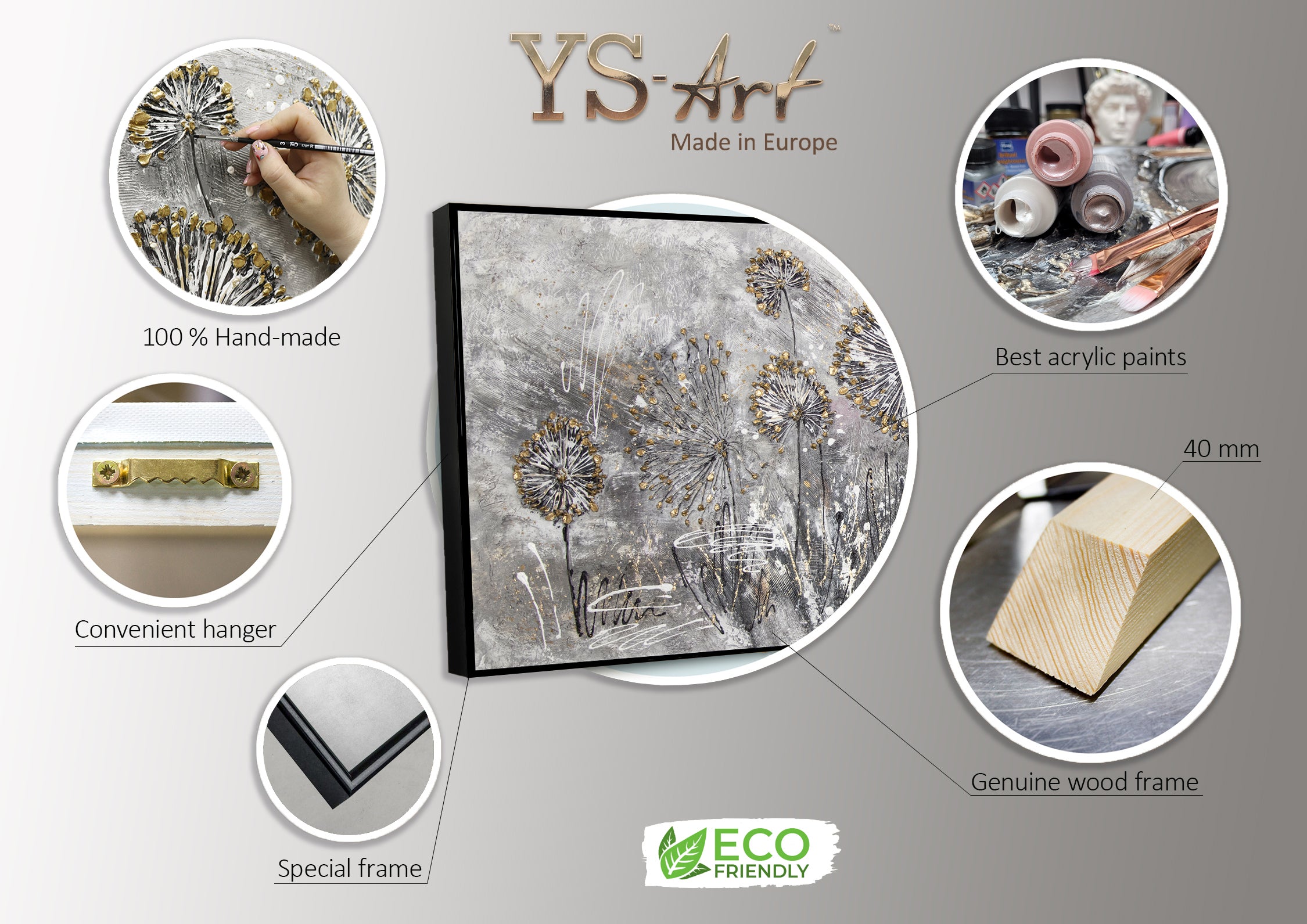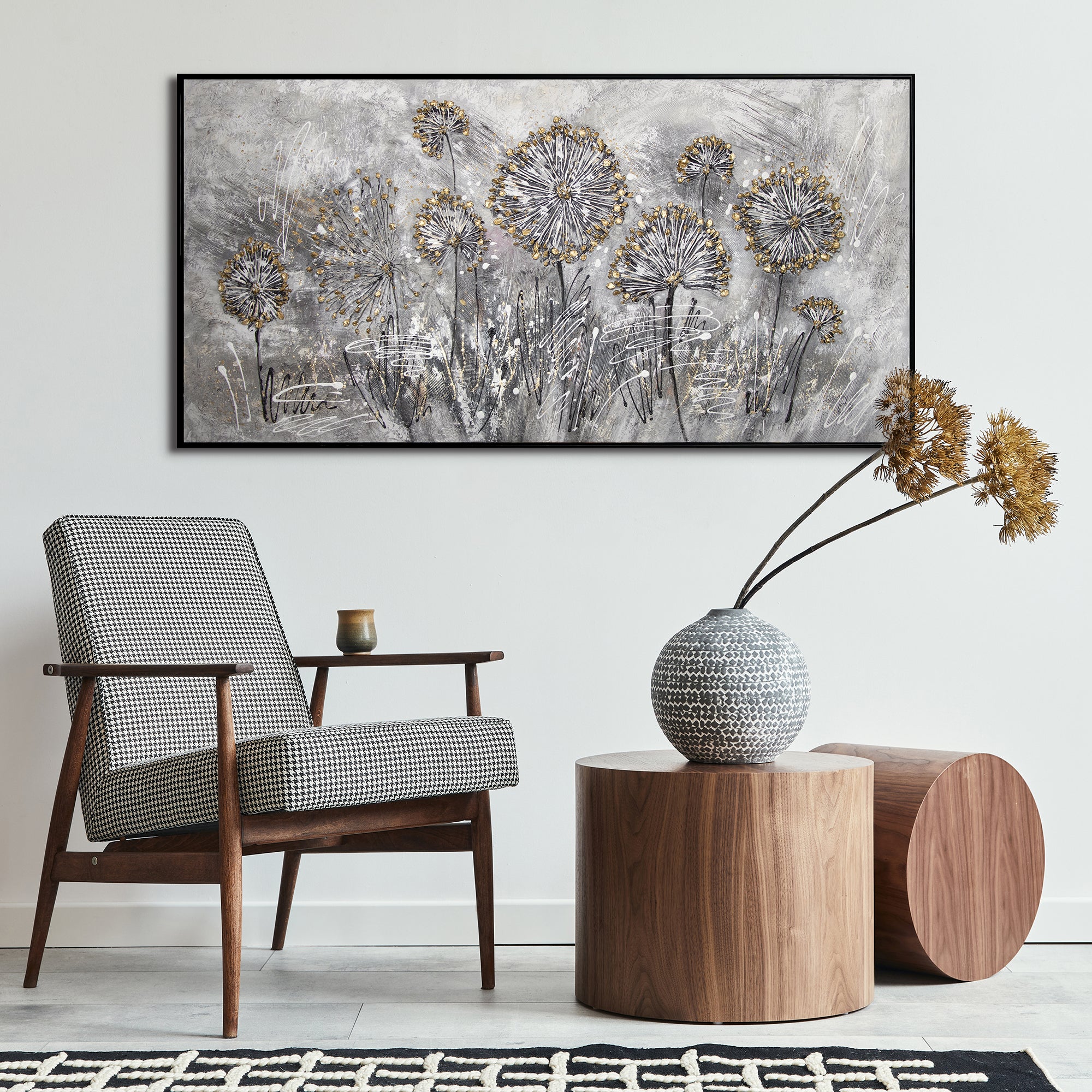 Add a special touch to your home with this hand-painted floral painting. The artistically designed flowers in shades of gray and gold create an elegant and modern atmosphere. Every detail of this painting is completely handmade, making each piece a unique work of art. Enjoy our free delivery directly to your home.