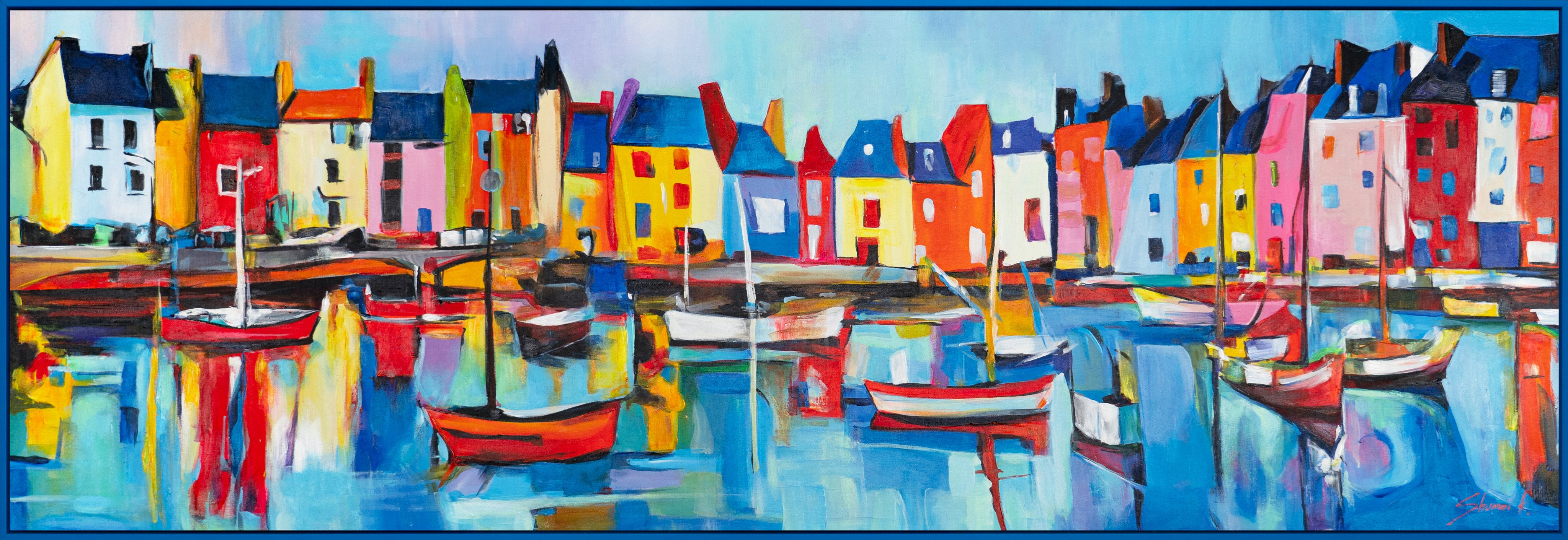 A hand-painted canvas full of liveliness: "Vibrant Harbor" captures a colorful harbor scene where boats gently float on the water, while vibrant house facades shine in the light. The textured application of Red, Blue, Yellow, and Pink brings dynamism to each scene, making the composition energetic and cheerful.