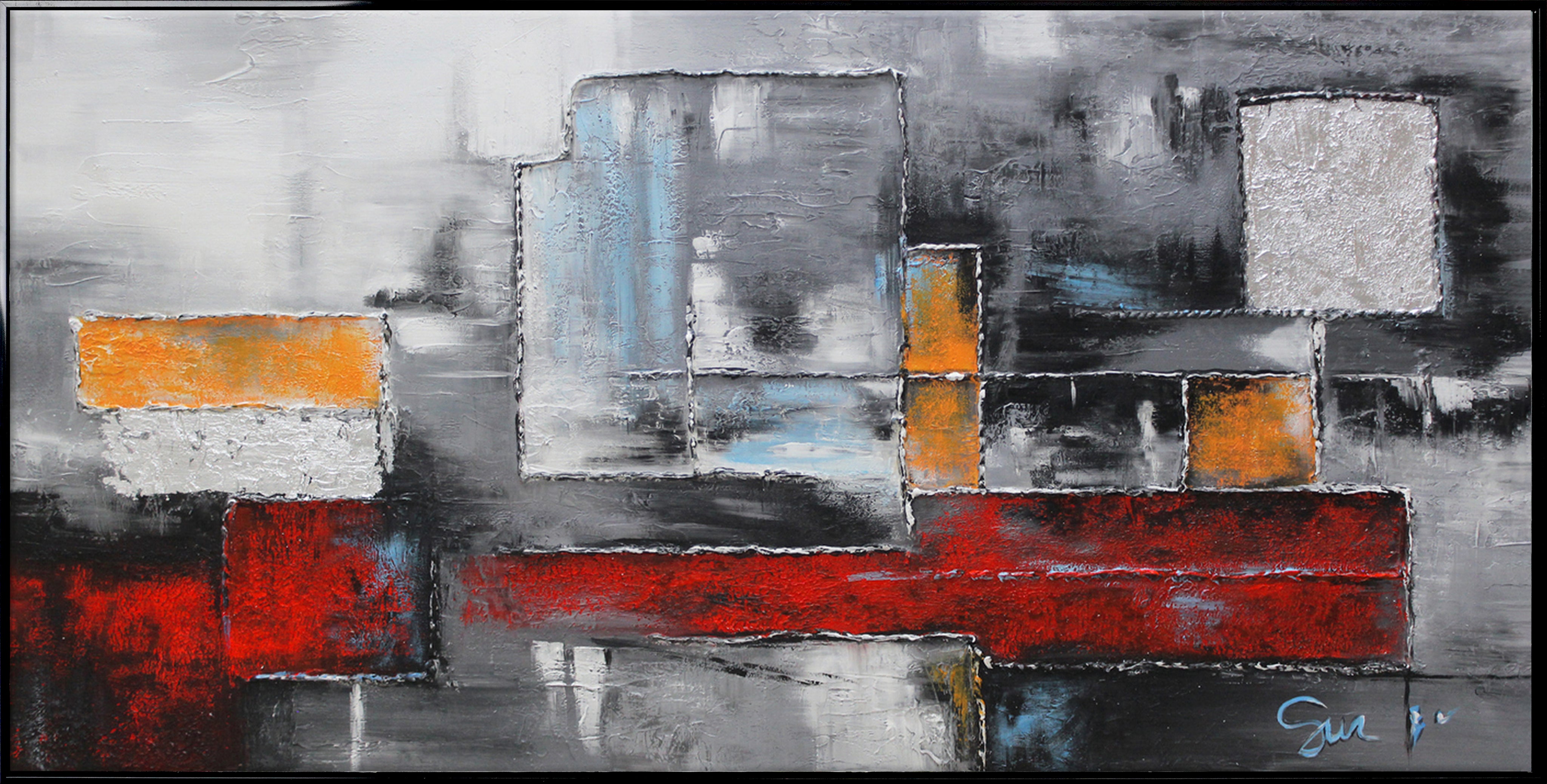Enrich your home or office with this modern, abstract artwork, featuring a dynamic composition in bold red, orange, and gray tones. The image captivates with its clear geometric shapes and expressive brushstrokes. It is 100% hand-painted and is highlighted by an elegant frame.
