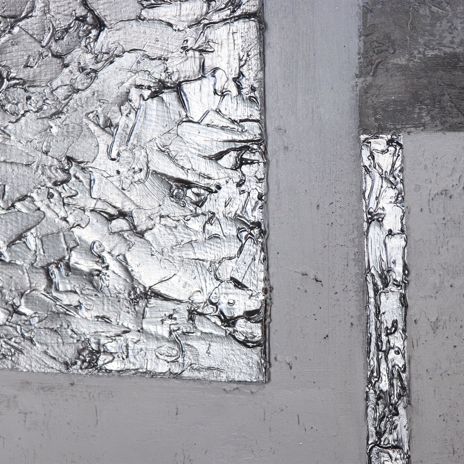 “Perfect Stability” is a modern abstract acrylic painting with a textured surface that impresses through its precise composition and minimal color palette. At its center, a silver rectangle with strong texture contrasts beautifully against smooth grey and white areas. Metallic accents add depth and elegance, while the balanced layout gives the artwork stability and harmony.