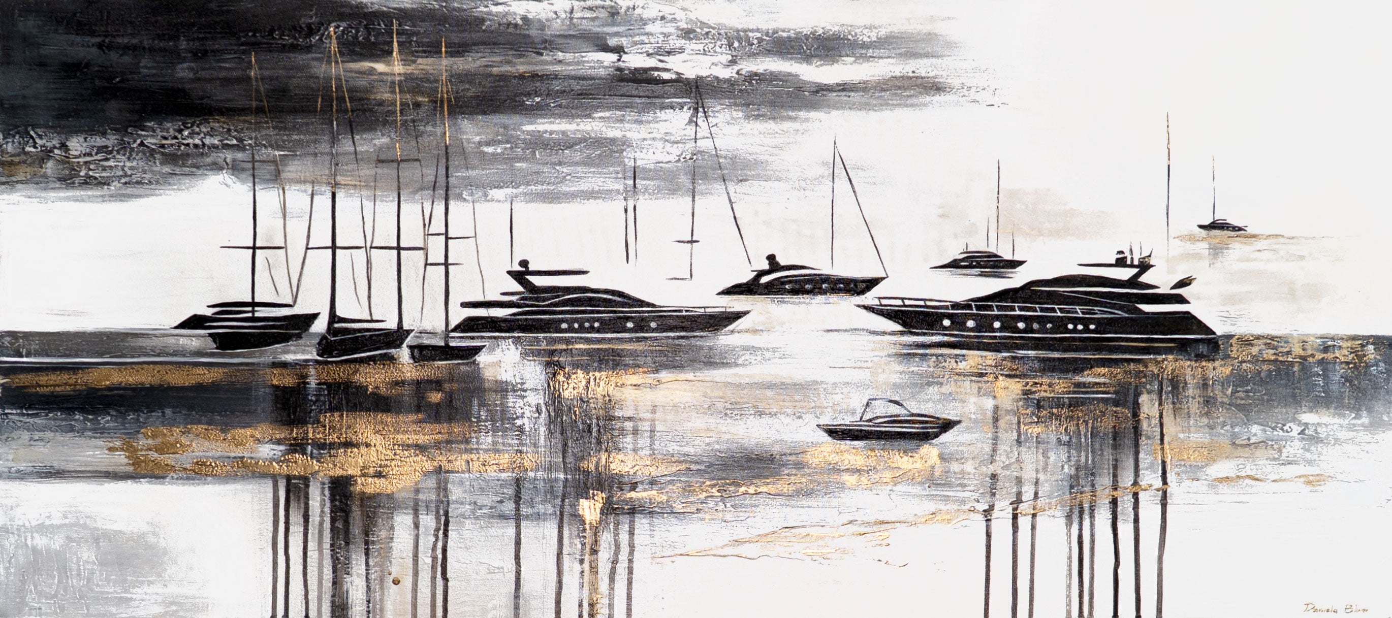 "Yachts" is a stylish, hand-painted acrylic painting on canvas depicting a serene maritime scene with elegant yachts in black, white, and gold. The textured brushstrokes add depth and shine to the depiction, while the monochrome contrast with golden accents creates a modern, luxurious atmosphere.
