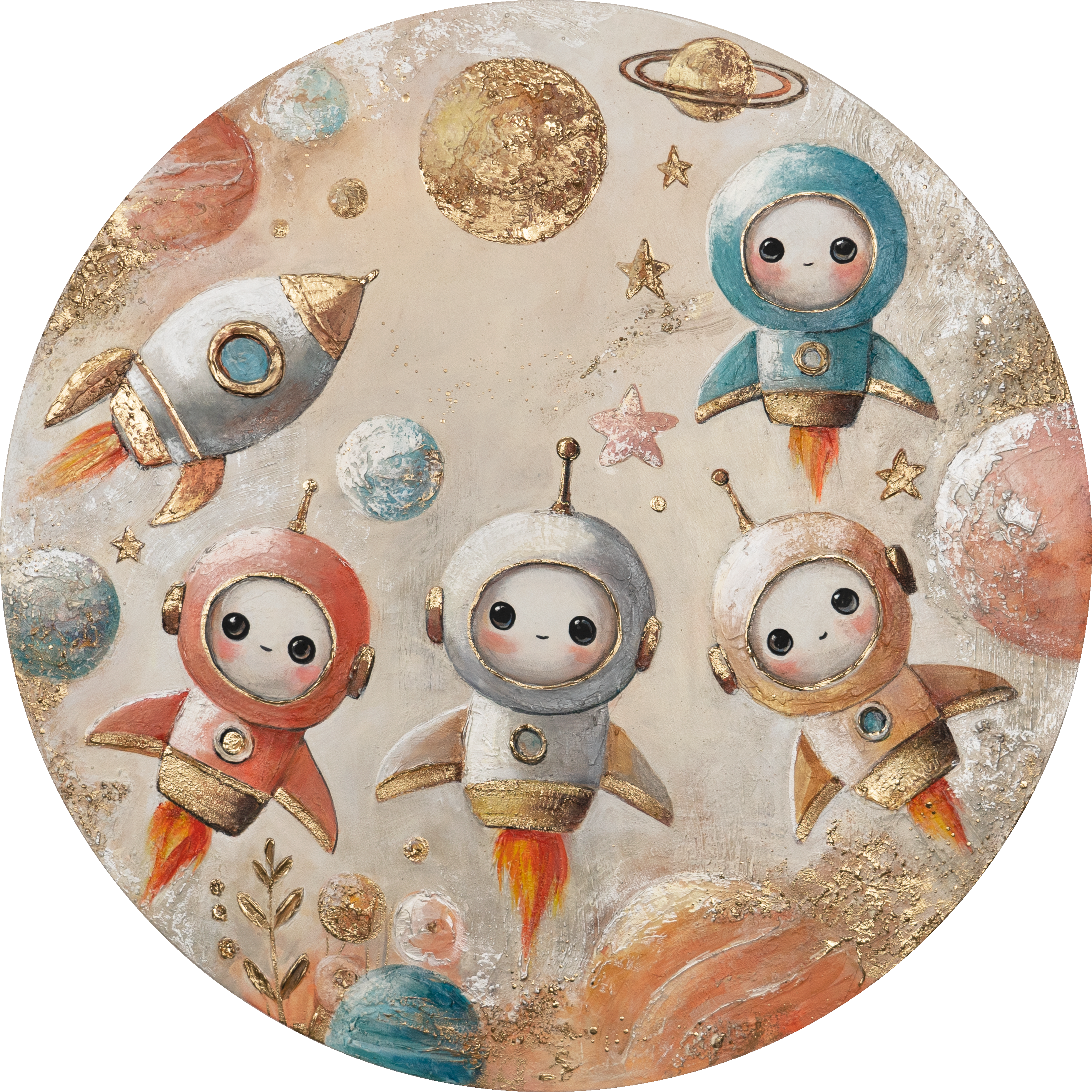 • Space Wall Art for Kids – Round Canvas Painting "Baby Astronauts", Handmade Acrylic