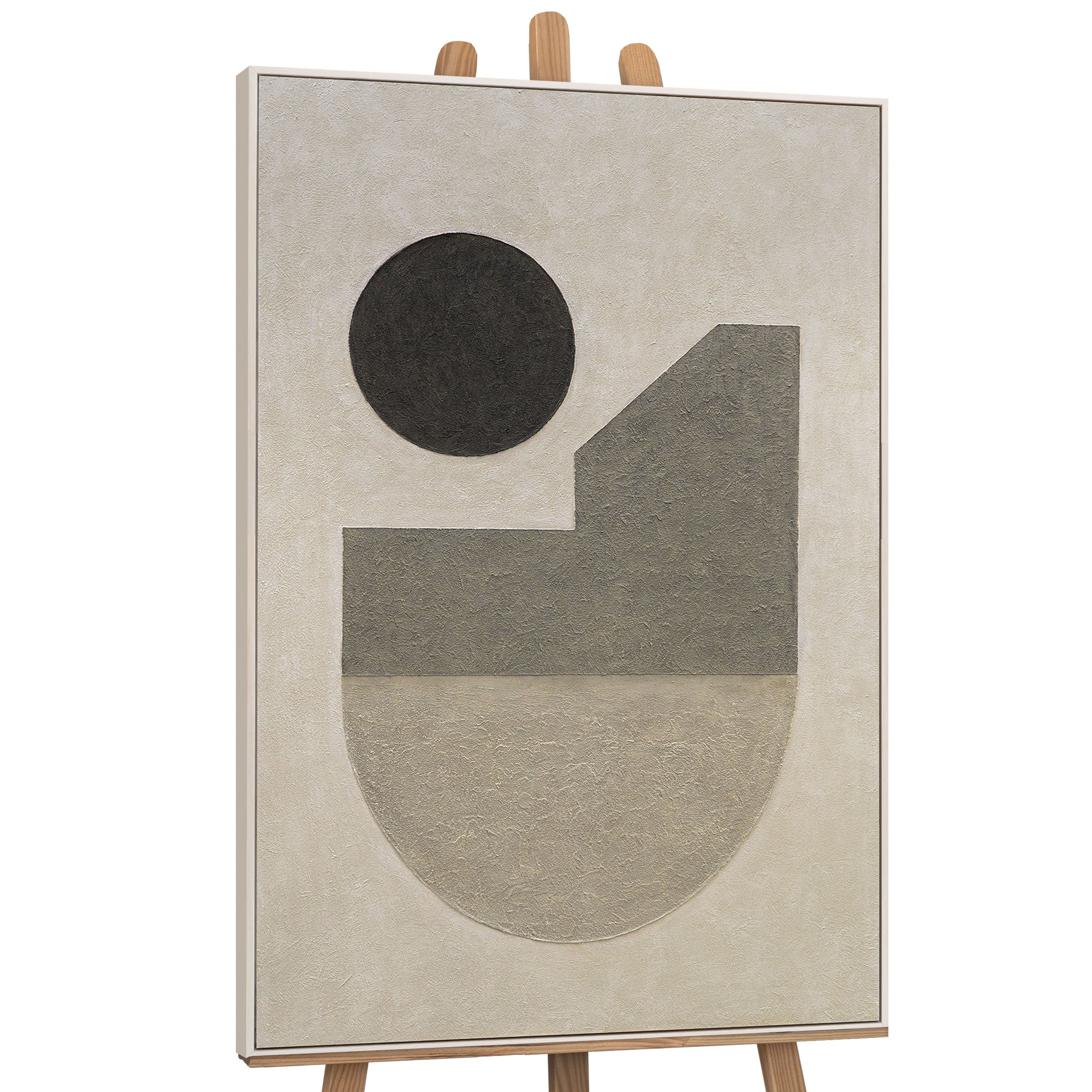 "The Stillness of Geometry" is a work of art characterized by balance and reduction. Simple geometric forms—circle, rectangle, and half-surface—meet with a delicate texture and harmonious shades of gray and beige. This composition conveys tranquility, precision, and the quiet elegance of minimalist design.