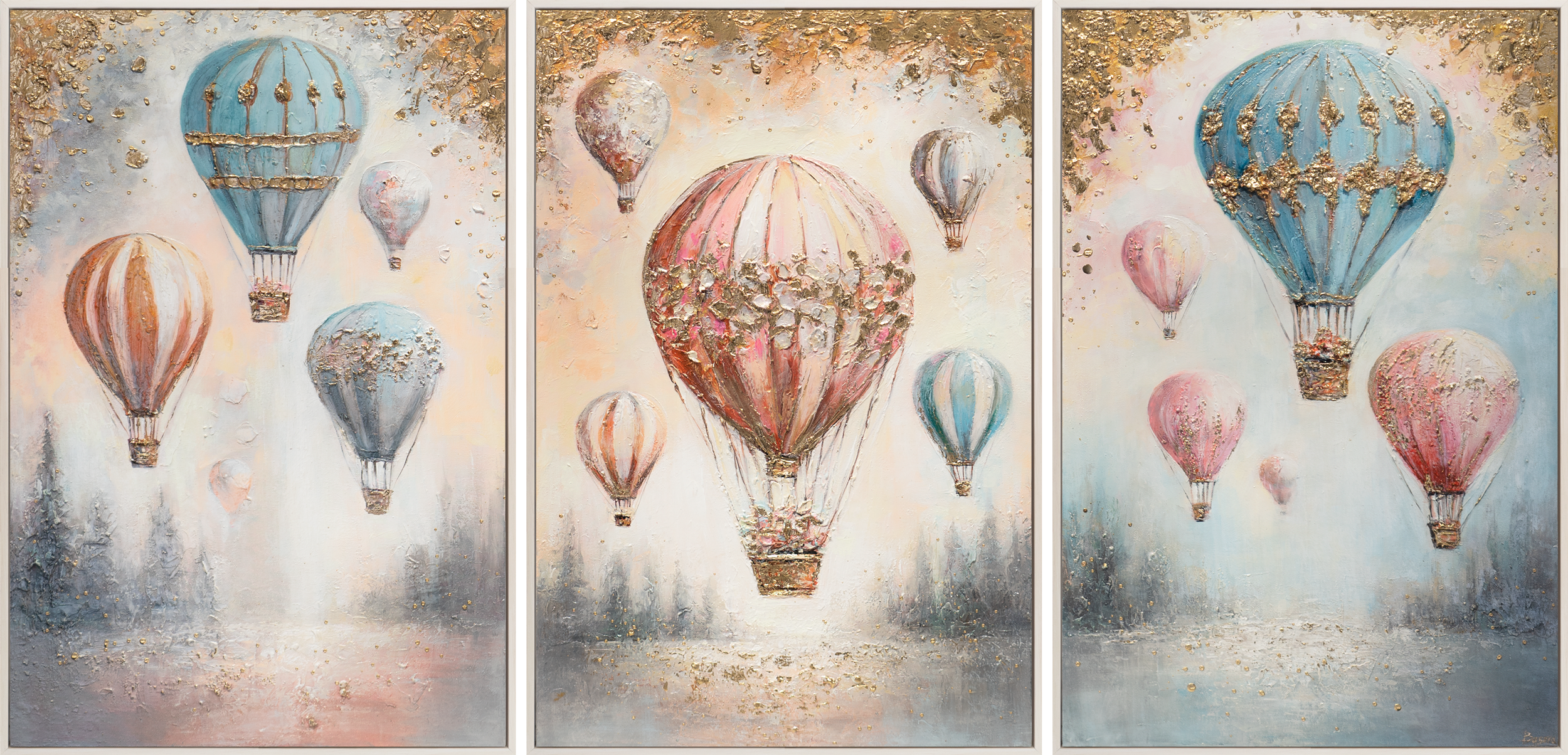 Het driedelige acrylcanvas “Luchtige Dromen” toont zachte pasteltinten met liefdevol geschilderde ballonmotieven en weelderige wolkenlandschappen. De handgeschilderde structuur geeft elk deel een levendige diepte en benadrukt de subtiele goudaccenten, waardoor een gevoel van lichtheid en geborgenheid ontstaat. Dit kunstwerk is ideaal voor het creëren van een warme en rustige omgeving voor de allerkleinsten.