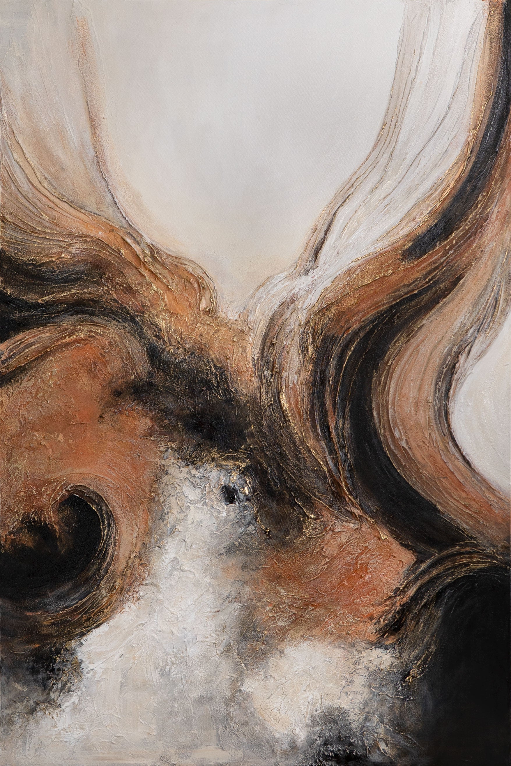"Element in Motion" is a hand-painted acrylic painting that captivates with its dynamic forms and contrasting color gradients. Dark black accents blend with warm brown and beige tones, while the textured surface creates depth and vibrancy. The relief-like design brings movement to the image, making it a striking piece of modern wall art.