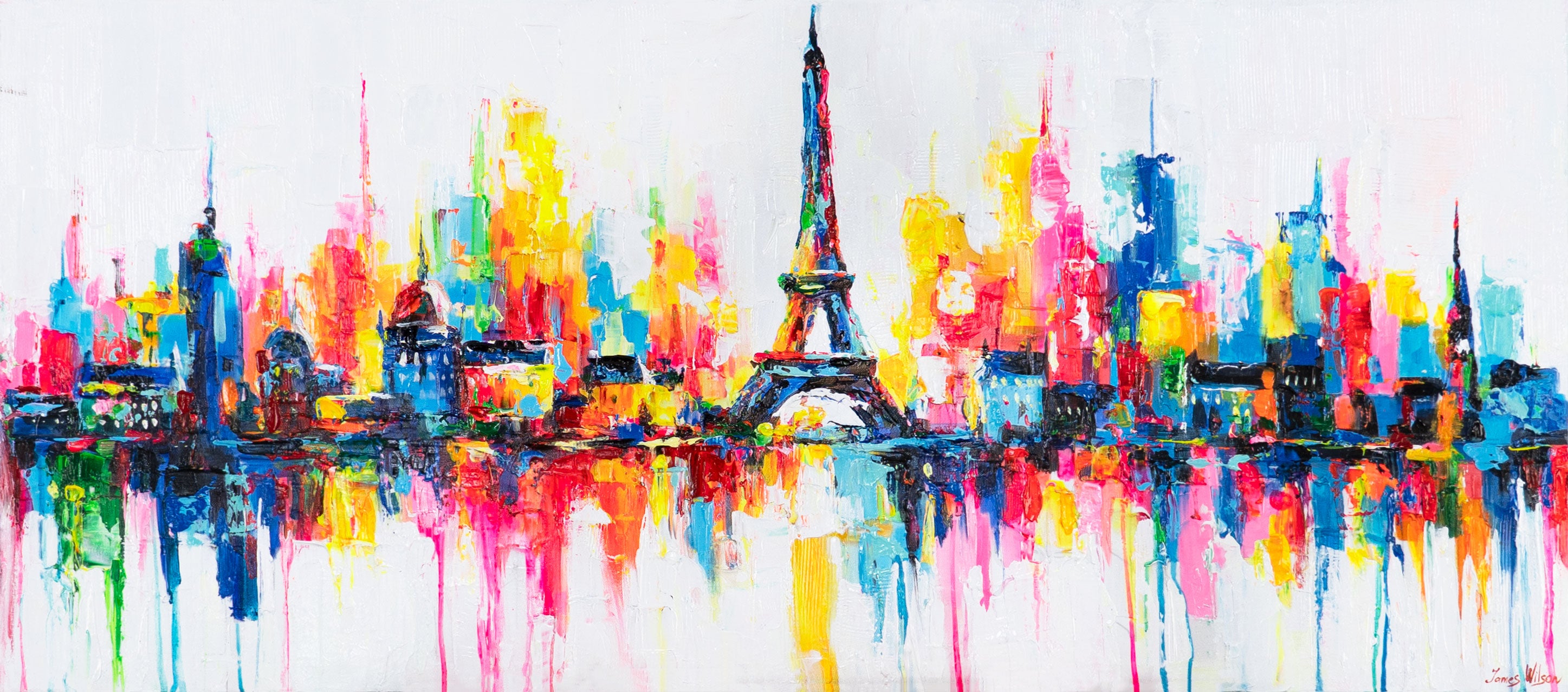 "Parisian Inspiration" is a hand-painted acrylic painting on canvas, depicting an abstract Paris skyline in vibrant pink, blue, and yellow tones. Expressive brushstrokes and bold splashes of color add depth and dynamism to the piece.