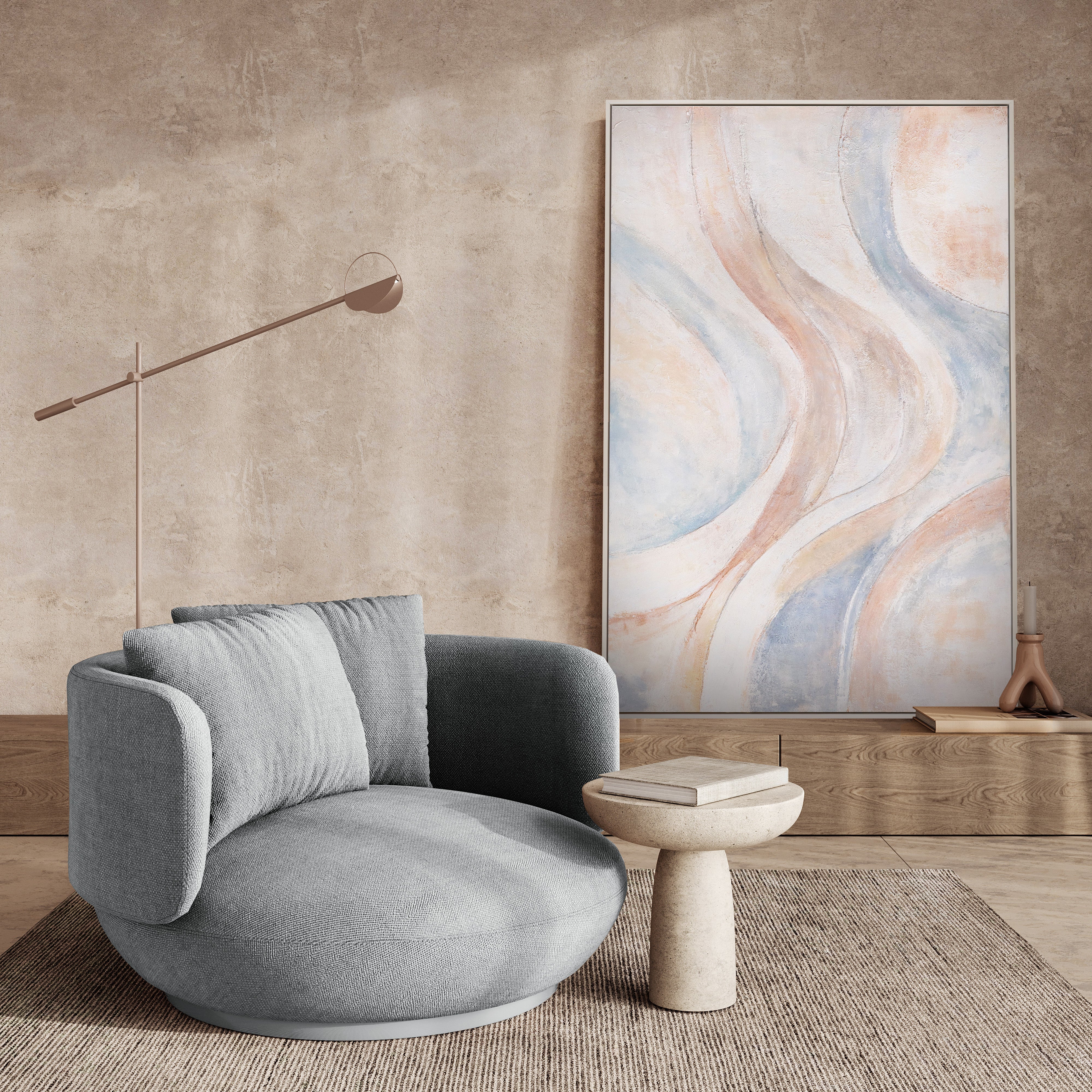 "Wind Lines" represents lightness, movement, and balance. This painting brings a calm dynamism to a room and is ideal as a subtle focal point or a harmonious complement to modern interiors.