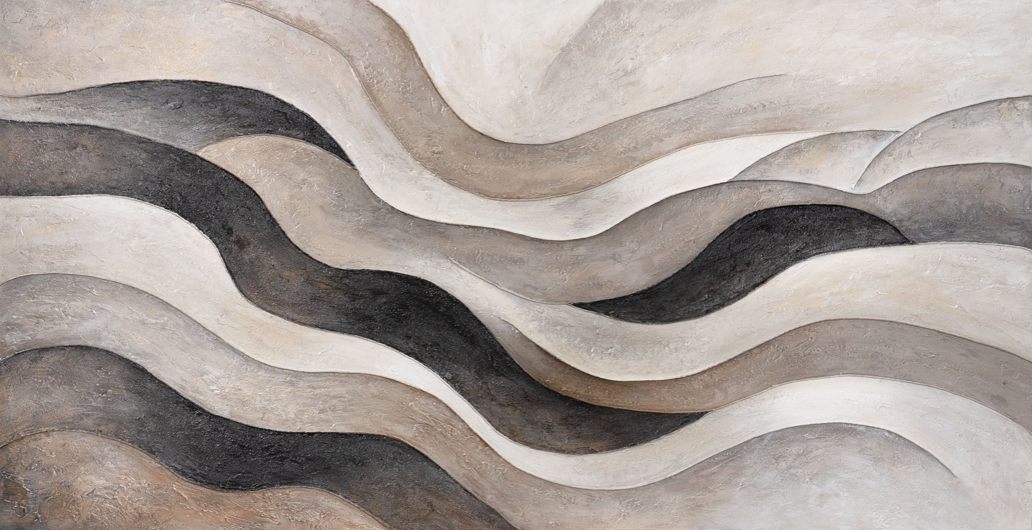 "Sand Waves" is a hand-painted acrylic painting on canvas that impresses with its organic forms and fine relief texture. In soft tones of Beige, Cream, Gray, and Black, flowing lines emerge, reminiscent of natural dune landscapes. Every brushstroke brings depth and movement to the composition, creating a harmonious play of light and shadow.