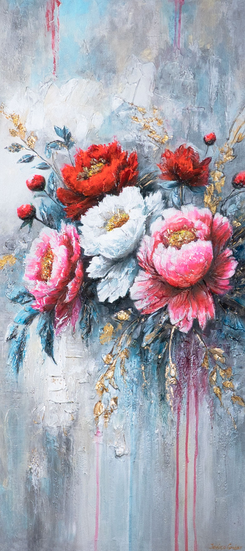"Blooming Peonies" is a hand-painted acrylic painting on canvas, featuring a harmonious blend of color intensity, floral elegance, and textured brushwork. The vibrant peonies in red, white, and pink, combined with gold accents and a cool background, create a lively yet soothing effect.