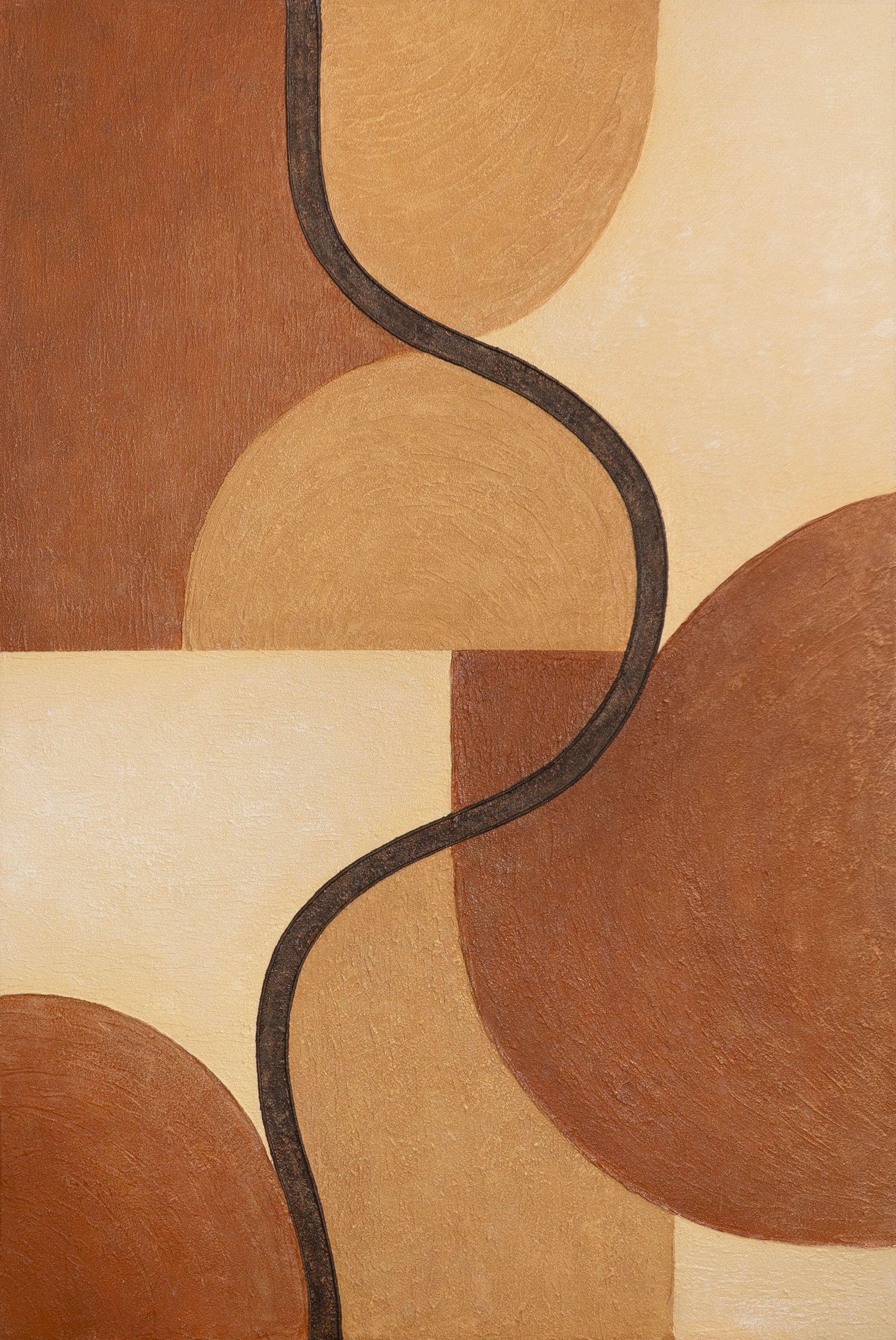 "Intertwining of Forms" is a hand-painted acrylic painting that captivates with its harmonious interplay of lines and shapes. The composition in warm brown, beige, and ochre tones creates a natural depth and a sense of movement. The relief-like texture adds dynamism to the geometric forms and lends the artwork a modern, tactile appeal.