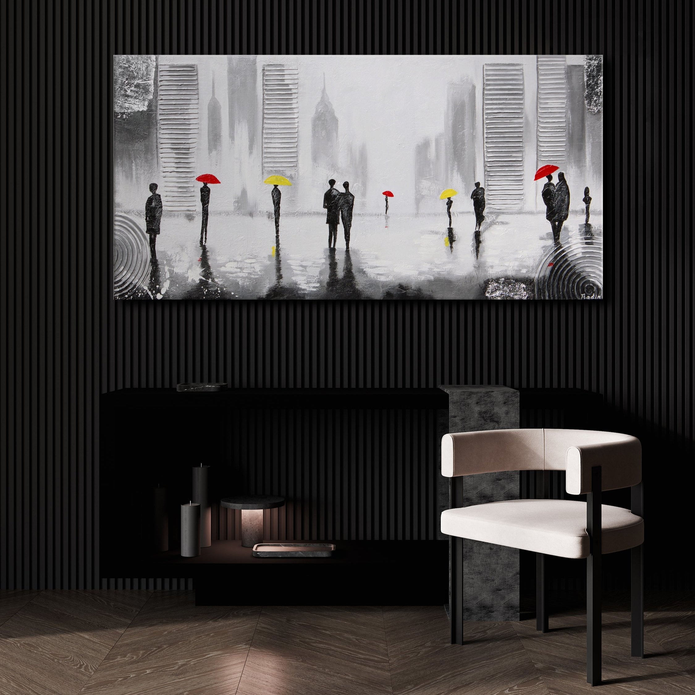 This hand-painted acrylic artwork captures an abstract urban scene, where silhouettes of people holding vibrant red and yellow umbrellas stand out against a gray city backdrop. The contrasting colors of the umbrellas break the monochrome gray and black tones of the city, bringing a modern and dynamic touch to the piece.