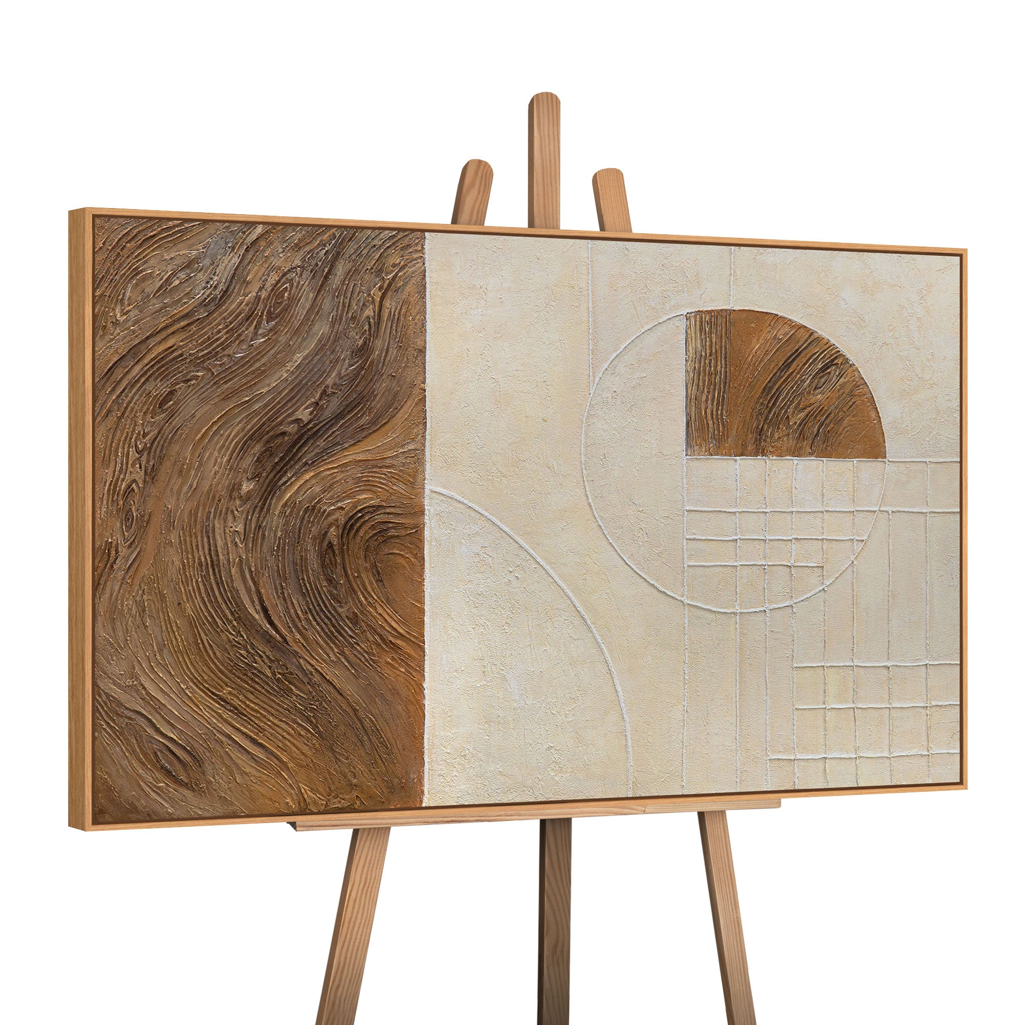 "Lines and Circles" is a play of contrast and balance. On one side, the natural wood grain flows in warm brown tones, while on the other, geometric lines and circles emerge in a calming beige. This composition unites nature and architecture, movement and precision—a work that embodies both tranquility and dynamism.