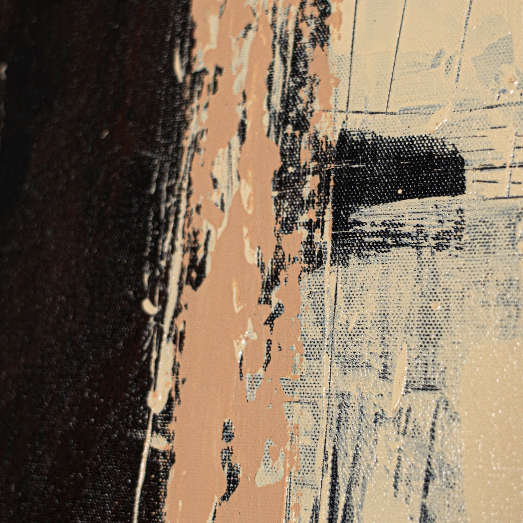 Painted on canvas and stretched over a solid wooden stretcher frame, this large abstract painting reveals visible brush movement and layered texture that emphasise the physical nature of the work. A protective water-based varnish is applied to preserve contrast, surface quality and colour stability over time.