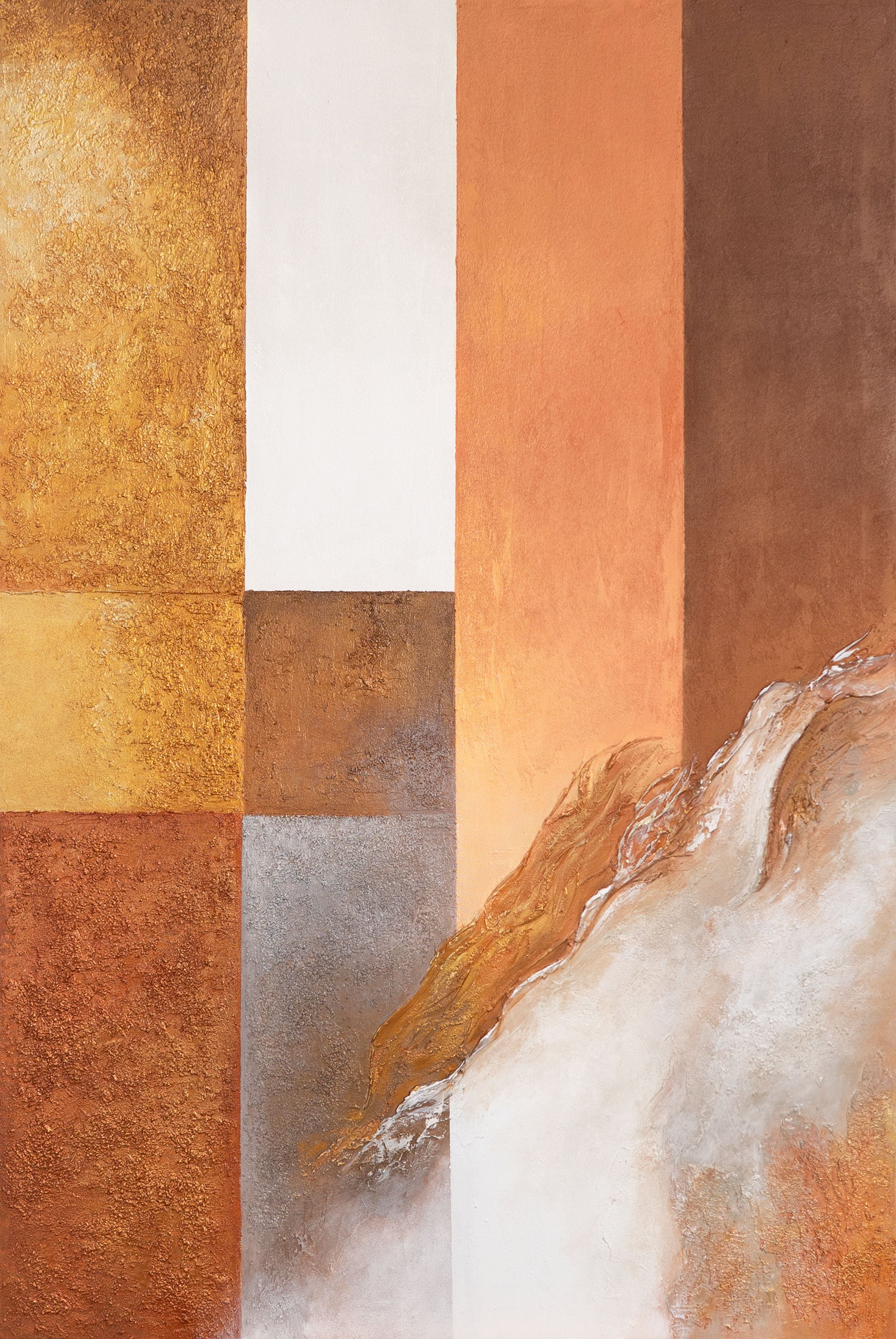 "Harmony of Forms" is a hand-painted acrylic painting that impresses with its combination of geometric structures and soft color gradients. The palette of warm orange, gold, brown, and subtle natural tones lends the work depth and a sophisticated sheen. The relief-like texture enhances the artistic character and makes every surface a unique experience.