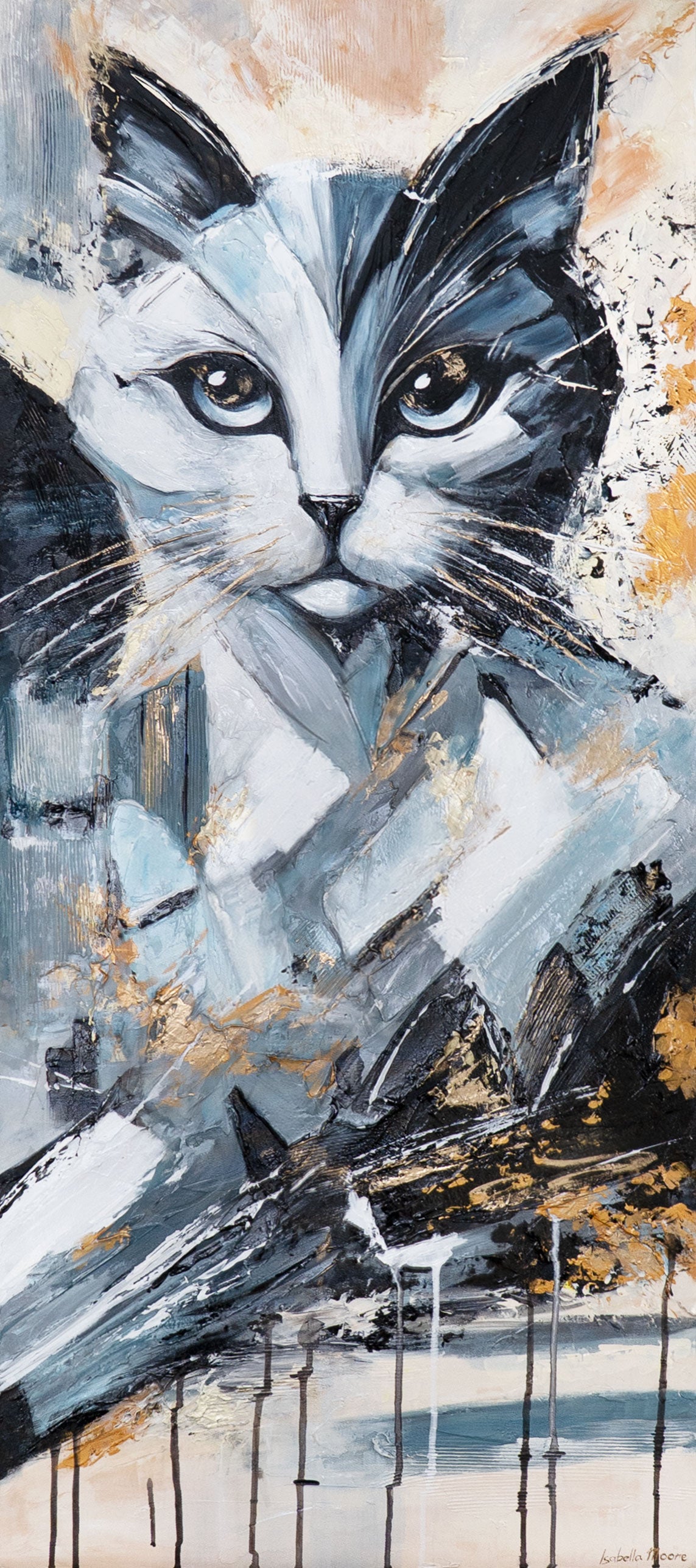 "The Secret of the Cat" is a hand-painted acrylic painting on canvas, featuring an abstract portrait of a cat with metallic gold accents. The reduced color palette of black and white emphasizes the animal's mysterious gaze.