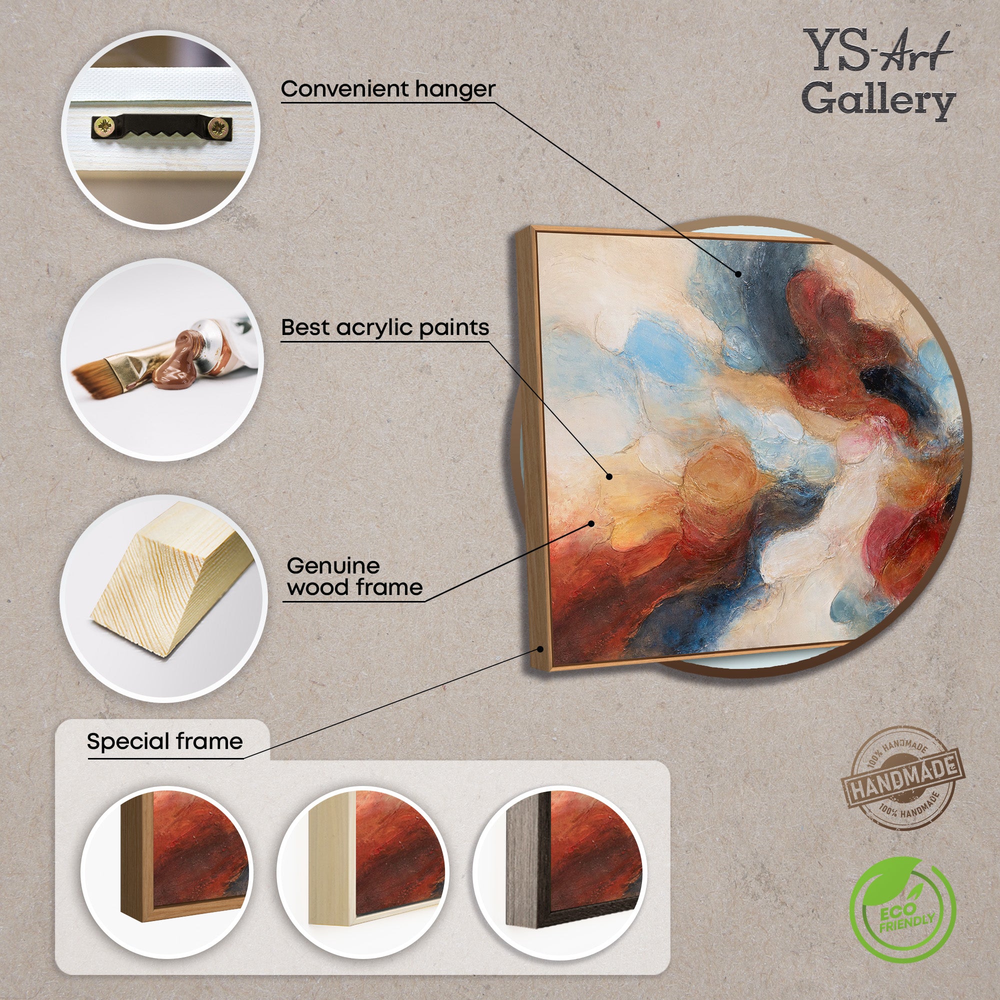 This framed painting is created using water-based acrylic paints, applied in layered strokes that blend warm earth tones with cool blue and soft neutral shades. The composition creates gentle movement and visual rhythm, making it versatile modern wall decor for a wide range of interiors. Its balanced palette allows it to work as large wall art without overwhelming the space. Each artwork is produced entirely in-house — no prints, no reproductions, no imports.