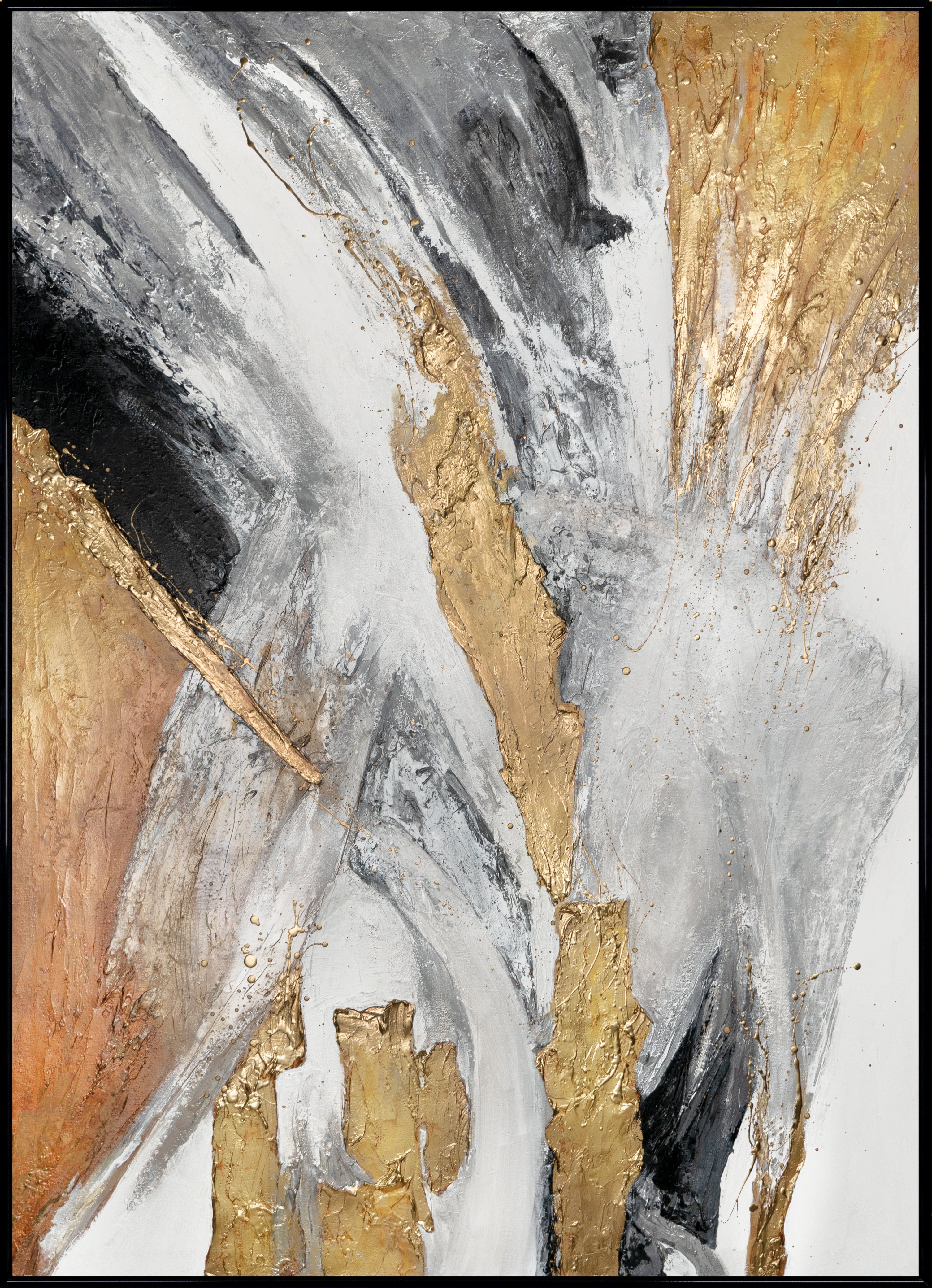 Enrich your home or office with this elegant abstract artwork, featuring a dynamic and modern composition in golden and gray tones. The image captivates with bold contrasts and expressive brushstrokes. It is 100% hand-painted and is highlighted by an elegant frame.