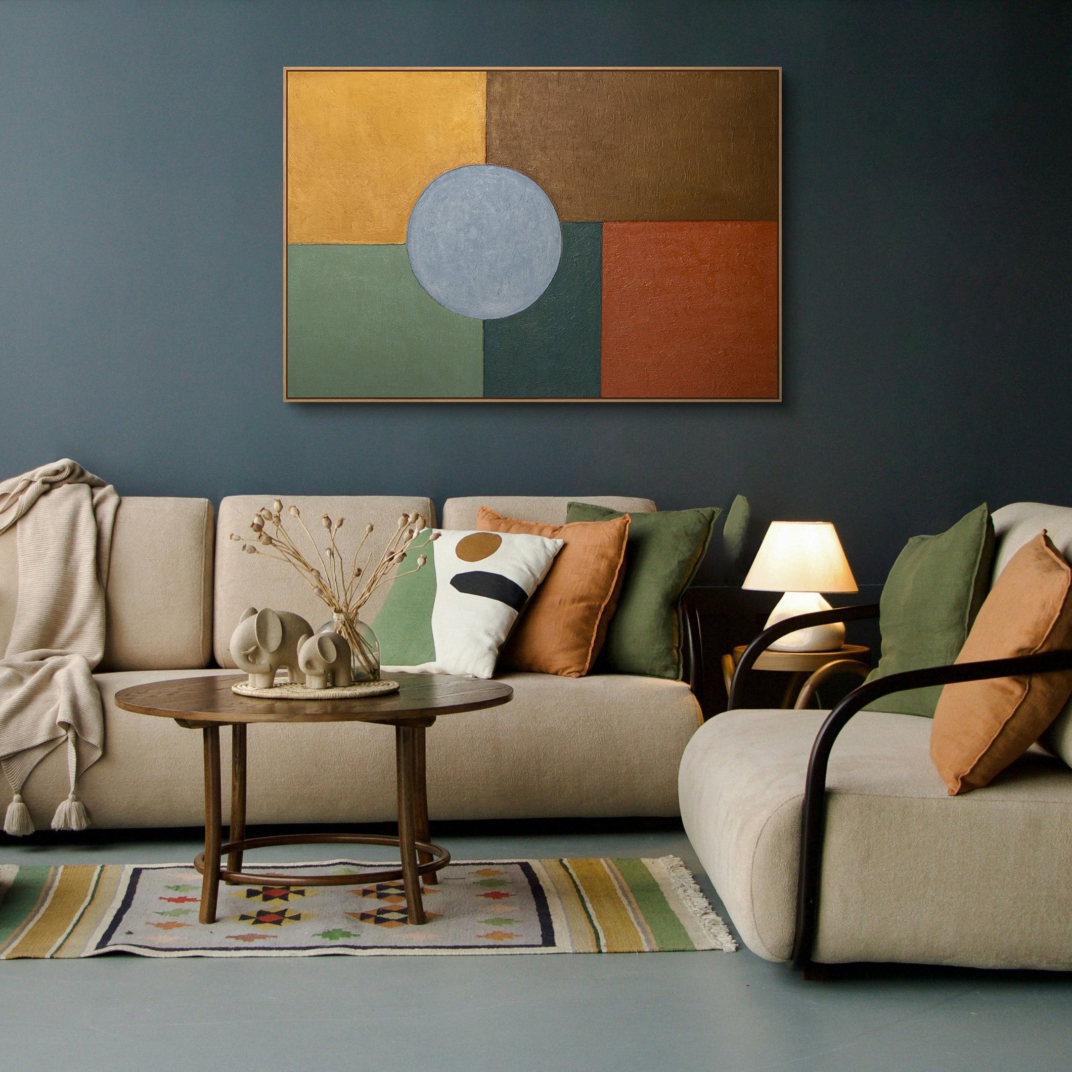 Das handgemalte Leinwandbild wird im Rahmen präsentiert und eignet sich ideal für moderne Wohnräume, Essbereiche oder stilvolle Büros. Die ruhige Farbkomposition schafft Ordnung, Stabilität und eine warme, zeitlose Atmosphäre im Raum.