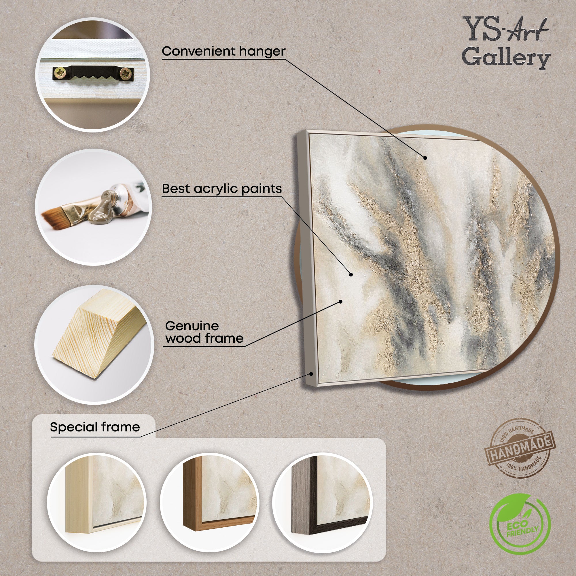 „Wolkenmelodie“ verbindet weiche, wolkenartige Farbverläufe in Beige, Grau und Creme mit kraftvollen, goldenen Strukturbereichen. Die reliefartigen Akzente wirken wie natürlicher Fels oder mineralische Schichten, die sich aus der ruhigen Nebelatmosphäre heraus formen. Die Übergänge aus feinen Nebelschwaden und markanten Strukturen verleihen dem Gemälde Tiefe, Leuchtkraft und eine dynamische, dennoch sanfte Präsenz im Raum.