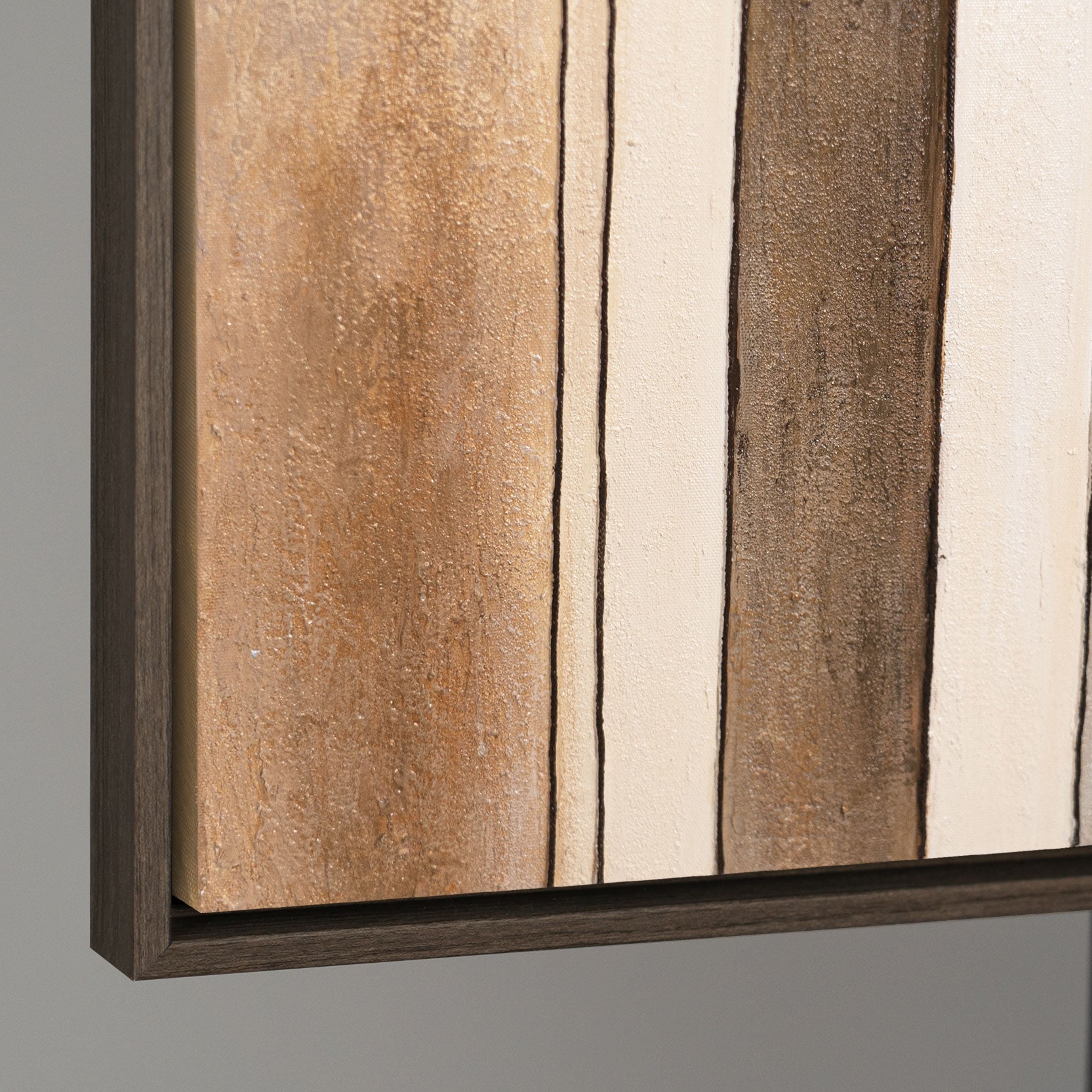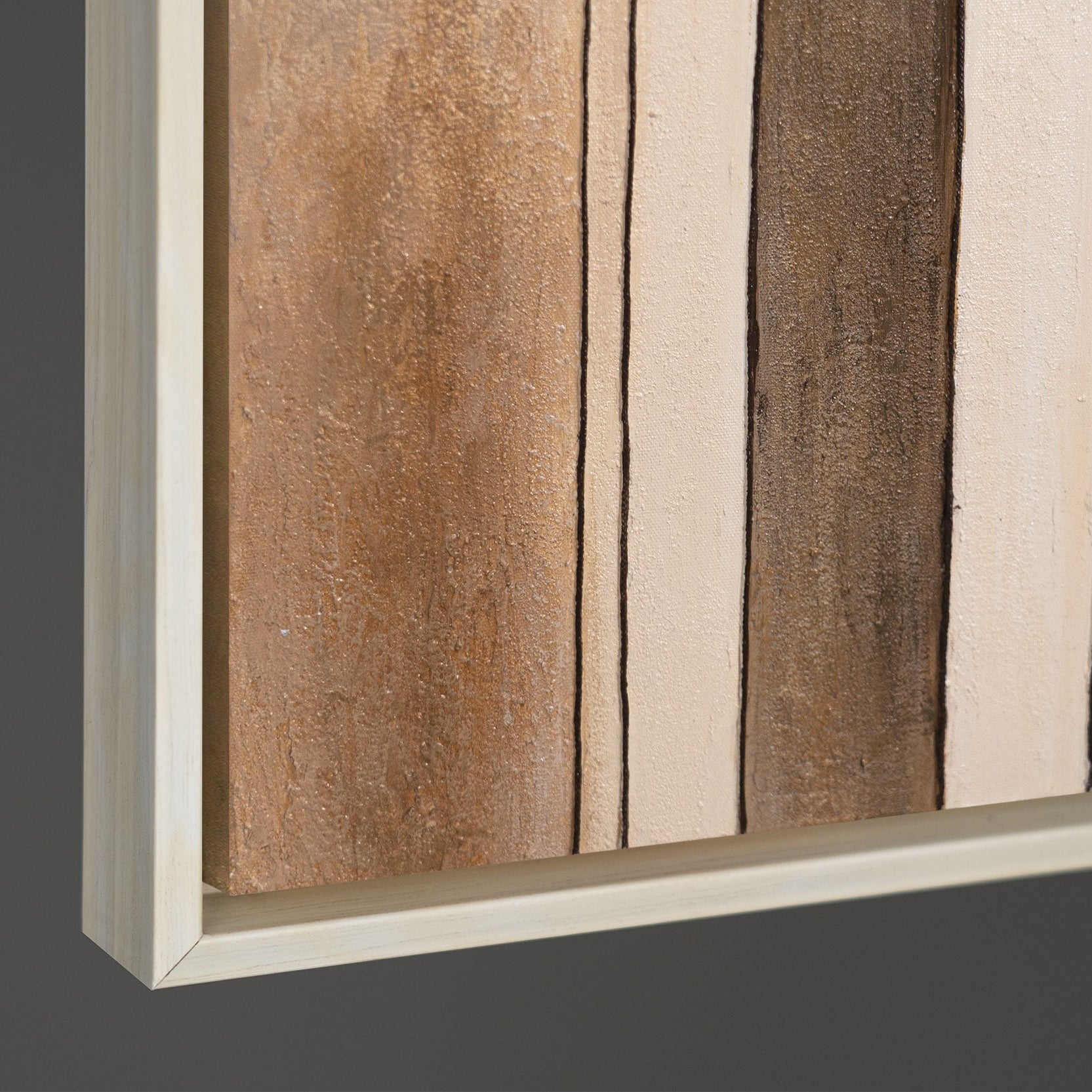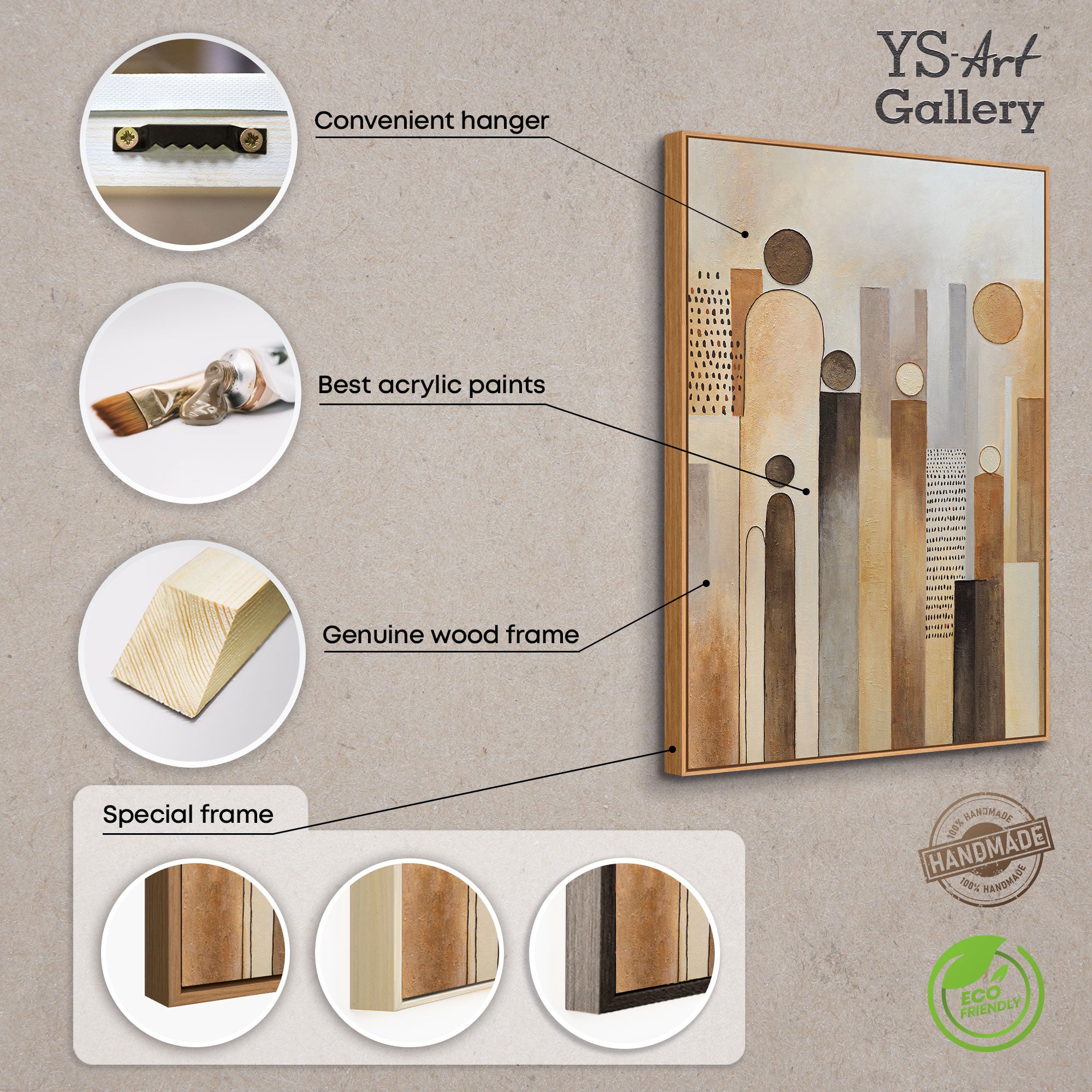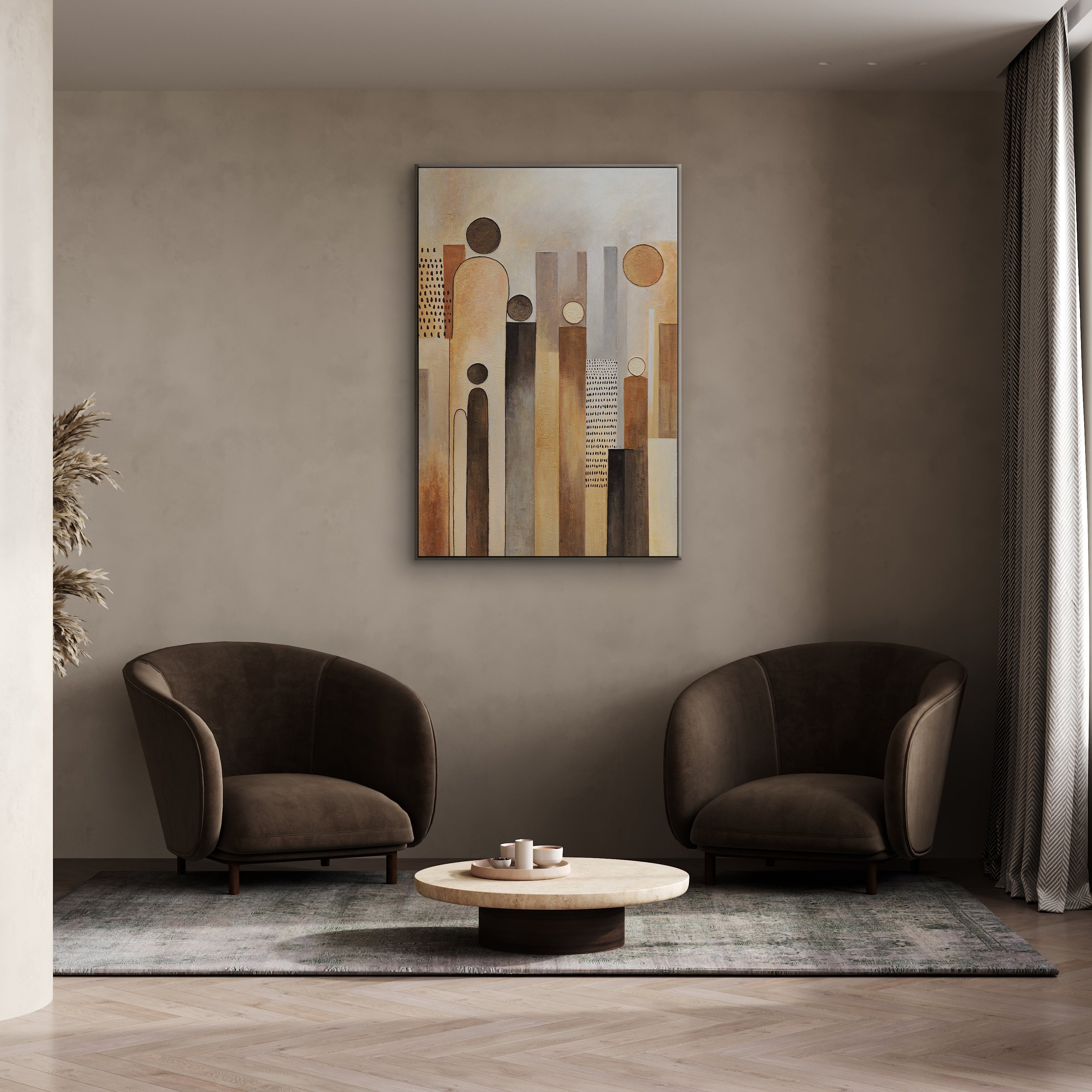 „Stadt der Figuren“ ist eine Hommage an das urbane Leben – reduziert auf Form, Rhythmus und Beziehung. Vertikale Linien wachsen wie Häuser in den Himmel, während Kreise die menschliche Präsenz symbolisieren. Die Komposition aus warmen Beige-, Braun- und Ockertönen vermittelt zugleich Bewegung und Ruhe. In ihrer klaren Struktur erinnert sie an den Herzschlag einer Stadt, der zwischen Nähe und Distanz pulsiert.